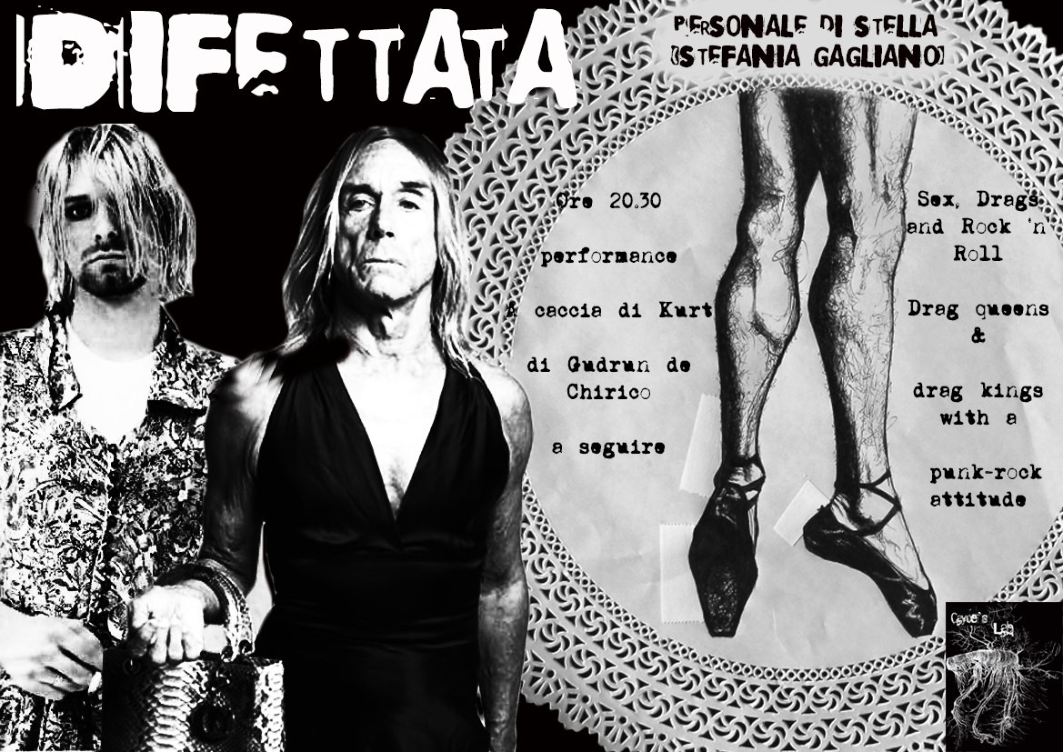Per l’otto marzo 2013 Cayce’s Lab non ne vuole sapere né dell’indagine sul corpo femminile, né delle collettive di “artiste donne”. Basta. È tempo di espandersi in orizzonti transgender, e di divertirsi un po’ a confondere i codici. Sex Drags and Rock ‘n’ Roll è una performance di operatori artistici trasformati in drag queens e drag kings dallo spirito fortemente punk rock. Come prologo, avremo A caccia di Kurt, un’azione della performer Gudrun De Chirico, che già per la seconda volta naviga per noi nelle limacciose acque del grunge (forse perché assomiglia come una goccia d’acqua a Mister Cobain?) Mischiando la favola di Cappuccetto Rosso alle litanie sulle armi di Full Metal Jacket, Gudrun De Chirico compone una delicata ed inquietante lirica sulla sparizione dell’ultima vera icona del rock. A seguire ci sarà la versione buona di Courtney Love. E poi, subito dopo, Nick Cave, Patti Smith, David Bowie ed Amy Winehouse.