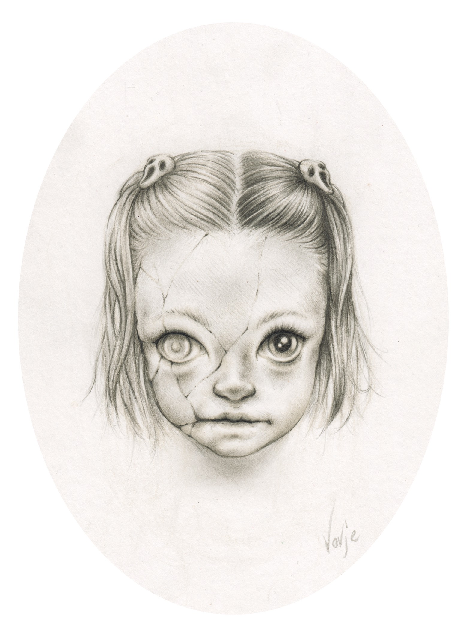Il tratto rinascimentale di Vavje racconta di bambole silenti, rotte, con le parole ferme in gola, come testimonianze di un tempo passato e di attimi negati. Bambine col volto crepato, come porcellane malamente aggiustate.