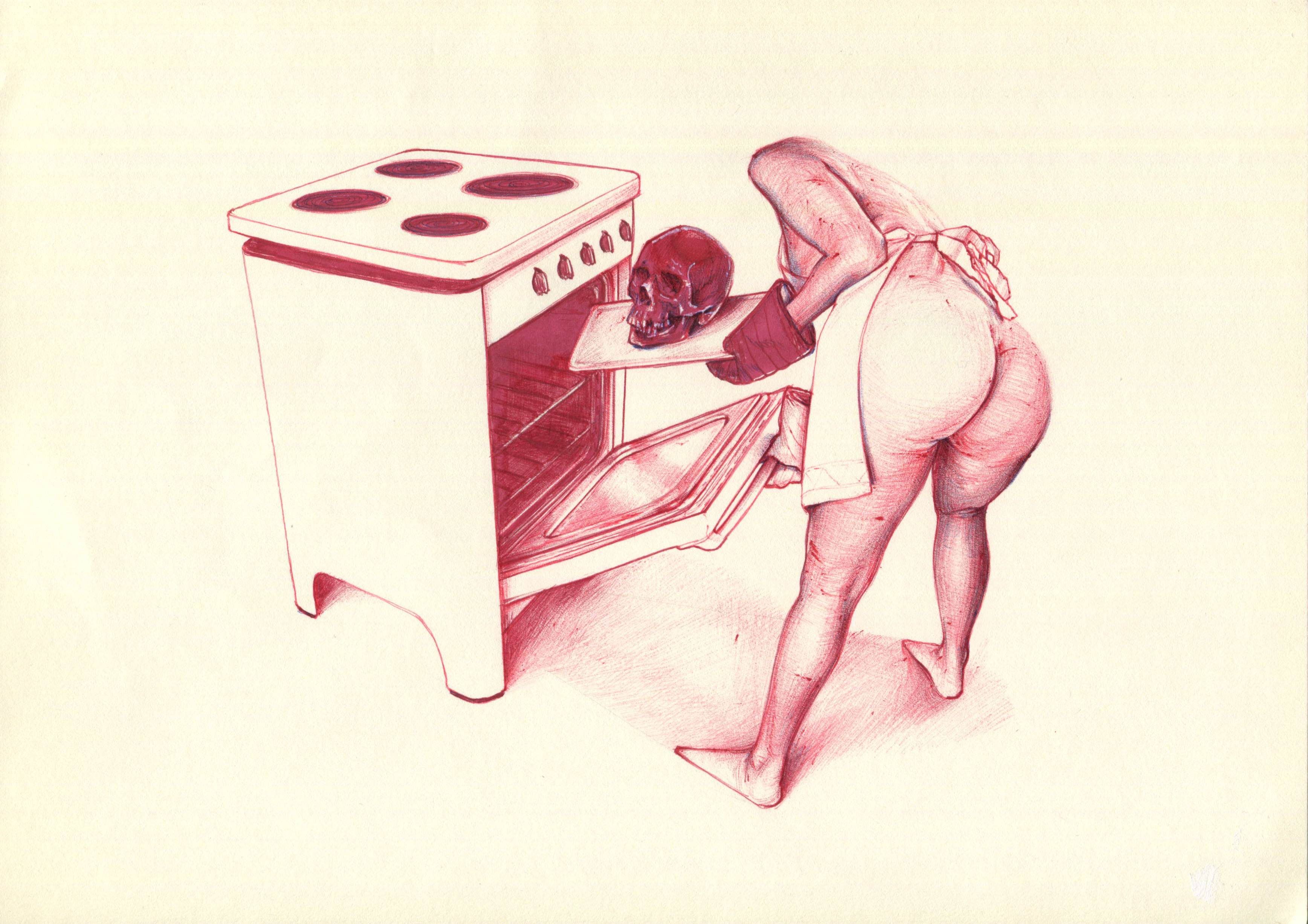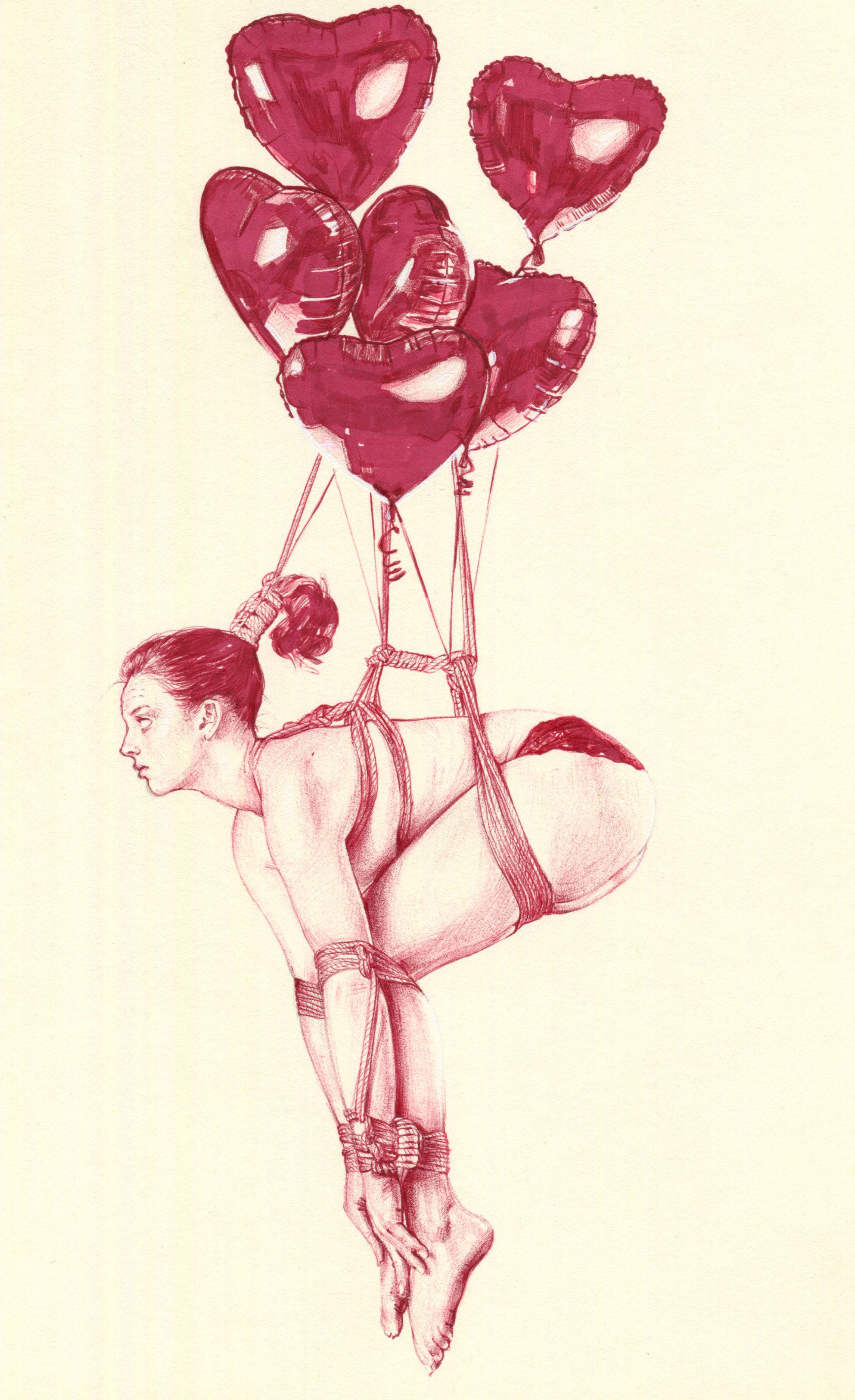 Il Male Divino è invece nella mano di Beniamino Leone che sceglie la penna anziché la matita come a voler stabilire che un errore lo si può forse correggere ma mai, cancellare. E le mani violentemente legate dalla delicatezza di un palloncino, specchi che mostrano riflessi inaspettati, teste staccate dal corpo come in un limbo tra ragione, perversione e sentimento. Figure che non cercano la grazia, che non vogliono sedurre nel modo che ci si aspetta… ma è un po’ come aprire una porta di una stanza, all’improvviso, e cogliere l’attimo crudo così come viene vissuto, autenticamente, in tutta la sua spietata dicotomia. Una ironica amarezza che, beffarda, si compiace della sua stessa provocazione.
