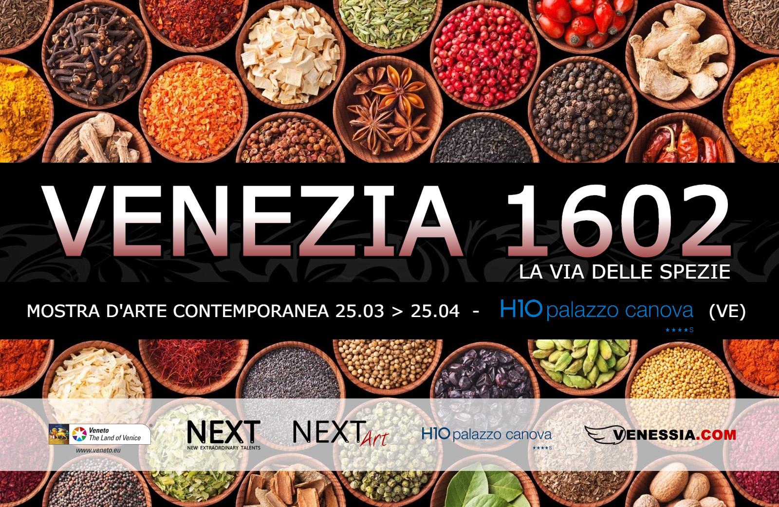 VENEZIA 1602. In questo 2023, ovvero 1602, sarà realizzata una collettiva di artisti in una location di eccezione: negli spazi espositivi dell’Hotel H10 Palazzo Canova, Riva del Vin 744 San Polo. Il tema dedicato a questo 1602 sarà “LA VIA DELLE SPEZIE”. Dieci artisti, che rappresenteranno il tema, realizzeranno ognuno un’opera includendo l’utilizzo di una o più spezie a piacere, mescolandole con il colore, applicandole sull’opera ancora fresca o in altro modo, come meglio suggerisce l’inventiva dell’artista. Il tema de “LE SPEZIE” è stato scelto ispirandosi al commercio che Venezia possedeva fin dai tempi della Repubblica Serenissima; ogni artista non sarà necessariamente legato alla spezia in sé ma al concetto che la spezia esprime e rappresenta: per secoli il commercio di spezie è stato anche un mezzo che ha dato la possibilità a culture diverse di venire in contatto ed influenzarsi, contribuendo ad arricchire il patrimonio di arte e bellezza che tutti noi oggi ammiriamo.
