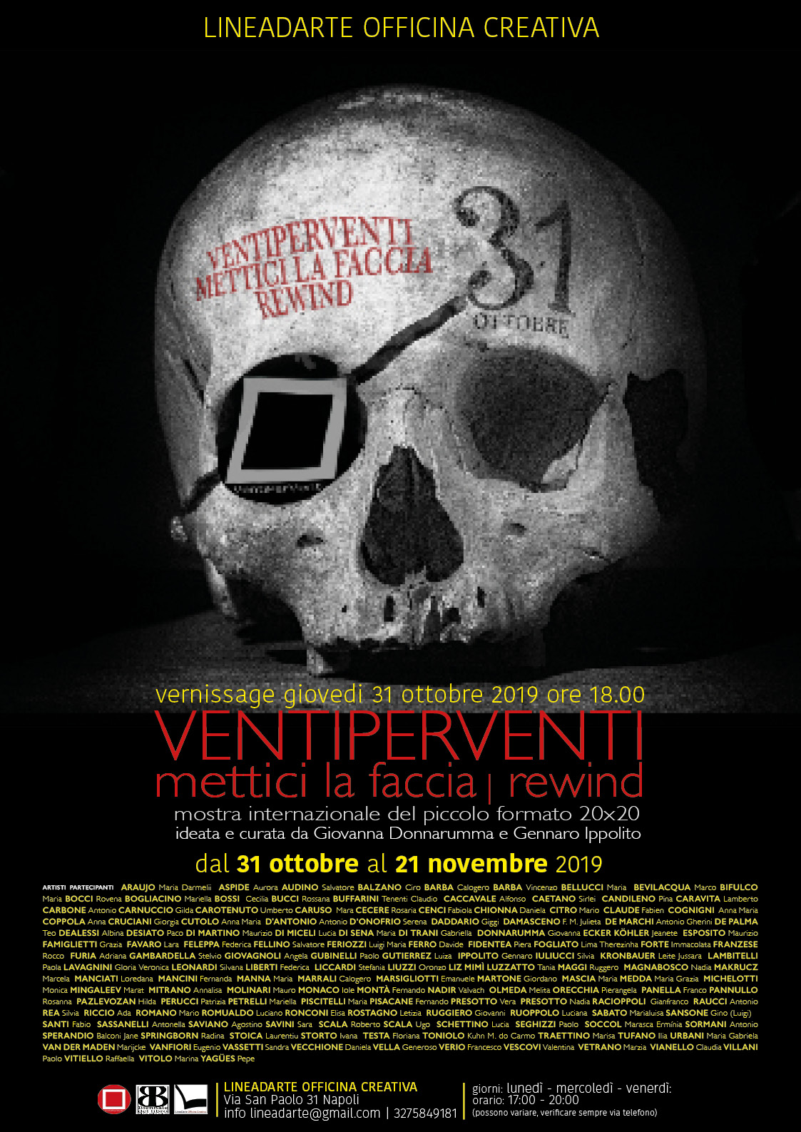 Giovedì 31 ottobre 2019 presso Lineadarte Officina creativa inaugura la Mostra internazionale del piccolo formato Ventiperventi, 20 cm per 20 cm, la manifestazione giunta ormai alla undicesima edizione ha visto partecipare nel corso di questi anni oltre 2000 artisti, vi hanno aderito, francesi, brasiliani, messicani, belga, svizzeri, russi, statunitensi, giapponesi, serbi, spagnoli