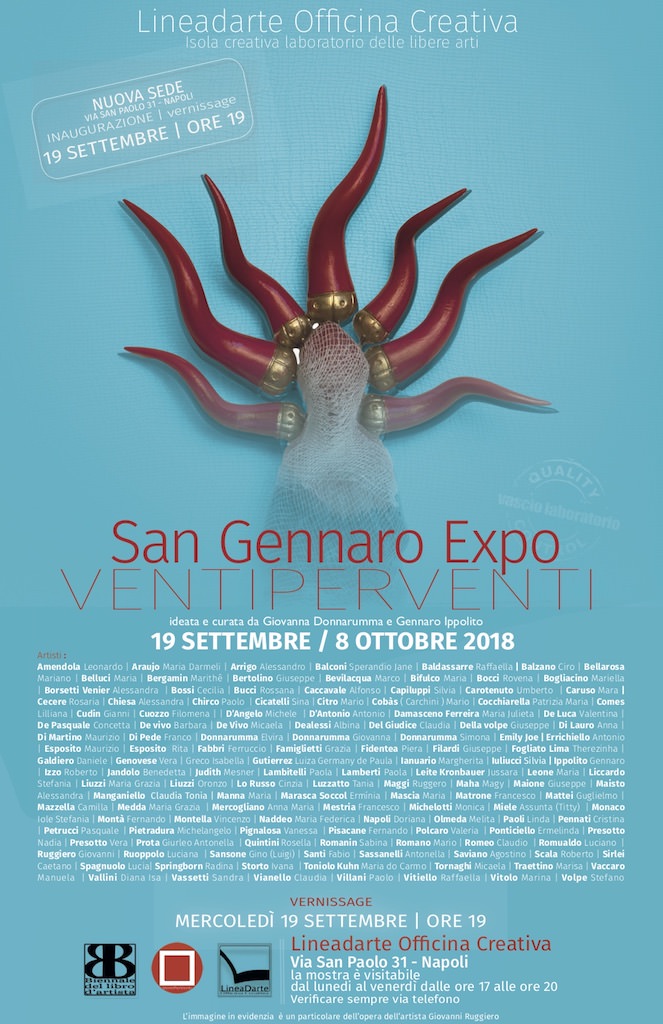 VENTIPERVENTI San Gennaro Expo – Simposio d’arte e creatività, decima edizione della mostra internazionale del piccolo formato 20×20. Ideata e curata da Gennaro Ippolito e Giovanna Donnarumma, promossa da Lineadarte Officina creativa. Questa edizione così come le altre vuole essere un omaggio alla napolitanetá. Chi più di San Gennaro a incarnare questo messaggio. Sacro, profano, spirituale, apotropaico rituale, propizia benedizione del Santo patrono che in questa edizione accompagnerà l’apertura della nuova sede di Lineadarte isola creativa laboratorio delle libere arti in Via San Paolo a Napoli nel cuore del centro storico. La mostra internazionale del piccolo formato Ventiperventi nasce dall’idea di rilettura in chiave contemporanea di quella che era la tradizione delle “riggiole”, mattonelle maiolicate di scuola napoletana formato 20×20, che, nei secoli passati decoravano le case cittadine da quelle reali a quelle più popolari ed é proprio in questa ultime che si palesavano le soluzioni più creative, visto che si adoperavano gli “scarti” di produzione. Come risultato un collage di bellezza, creatività, unicità e diversità. Da qui quindi la necessità di far dialogare linguaggi diversi, creatività diverse, culture diverse, autori diversi.