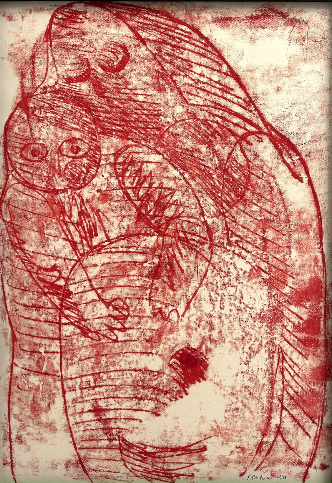 Questa forza emergente nella scultura, si fa corpo vibrante nel suo inesausto lavoro sulla carta. Qui, partendo dall’idea del monotipo, la materia dell’olio è stesa su tavola o cemento, su questa viene adagiata la carta per poi essere lavorata dal retro. Il colore nero, rosso e talvolta blu, trasferito attraverso la pressione dello strumento o dalle mani, risulta di un ricco spessore e in questo, esaltato dal segno rude dello scultore che dal retro incide la carta come fosse pietra, si rivela la dimensione della profondità. Profondità e luminescenza che inattese si rivelano anche in un nucleo di opere realizzate a china direttamente su tavole non preparate.