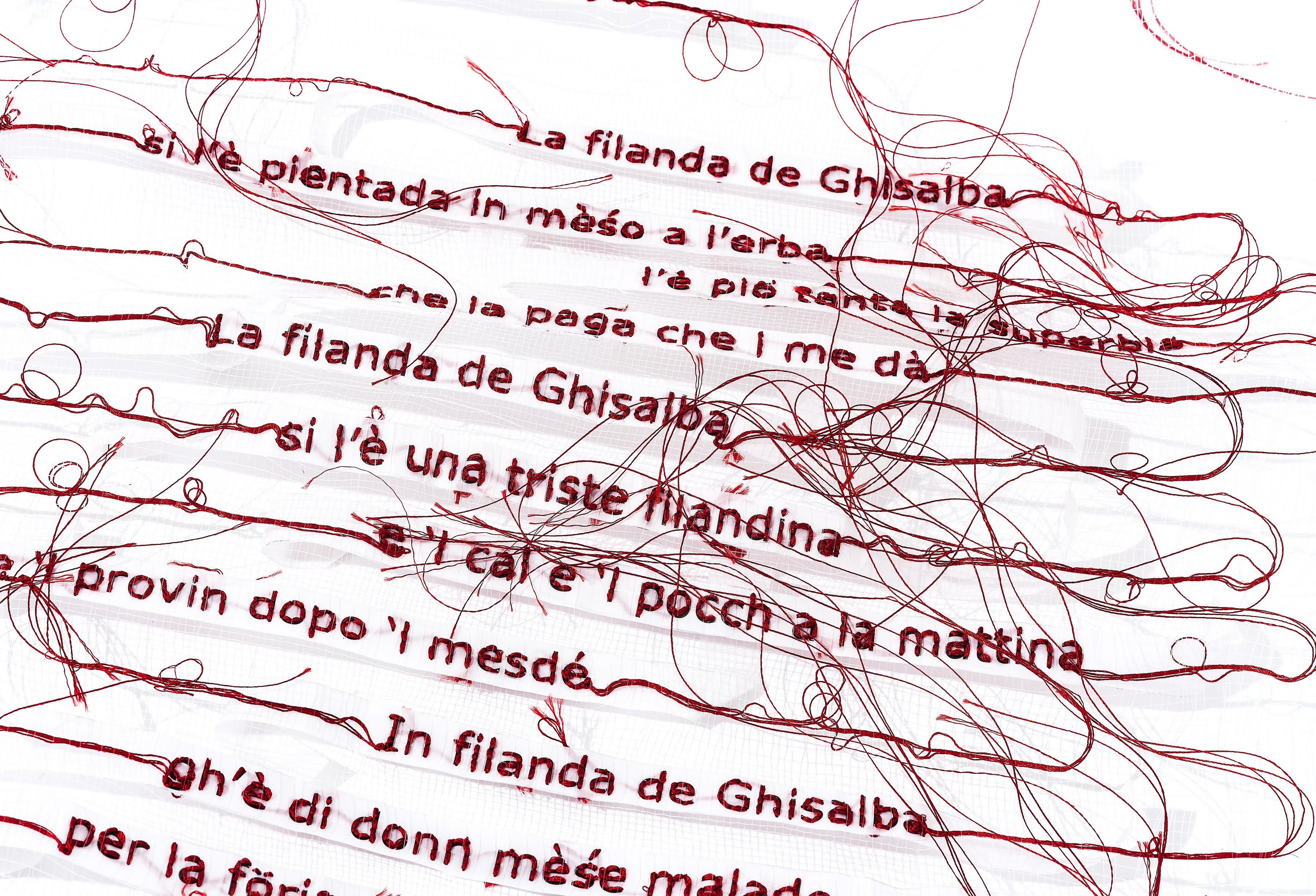 Silvia Beccaria presenta in mostra l'opera “Unfildivoce”, installazione di parole ricamate che riportano le strofe di canti popolari che le operaie delle filande cantavano nella prima metà del Novecento. Le parole dei canti ci giungono flebili ma contemporaneamente intense, parole che non si perdono nel vento ma che cercano di farsi sentire perché la memoria possa combattere la negazione dei diritti dell’oggi.