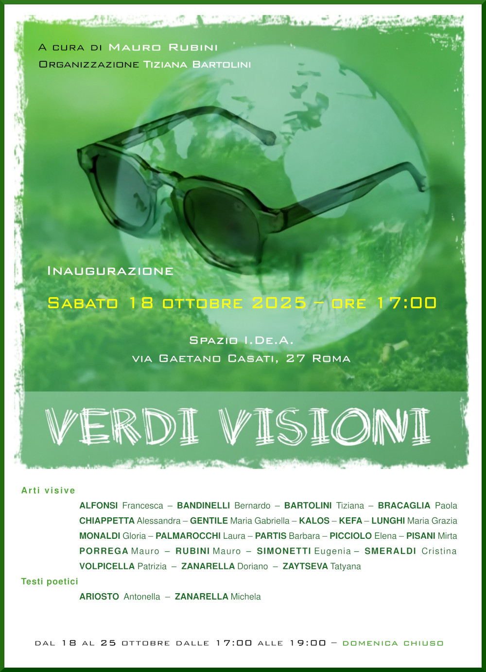 ROMA - Sabato 18 ottobre 2025 alle ore 17:00, in via Gaetano Casati 27 verrà inaugurato l’evento artistico VERDI VISIONI – per vivere green che potrà essere visitato fino a sabato 25 ottobre dalle 17:00 alle 19:00 (festivi esclusi).