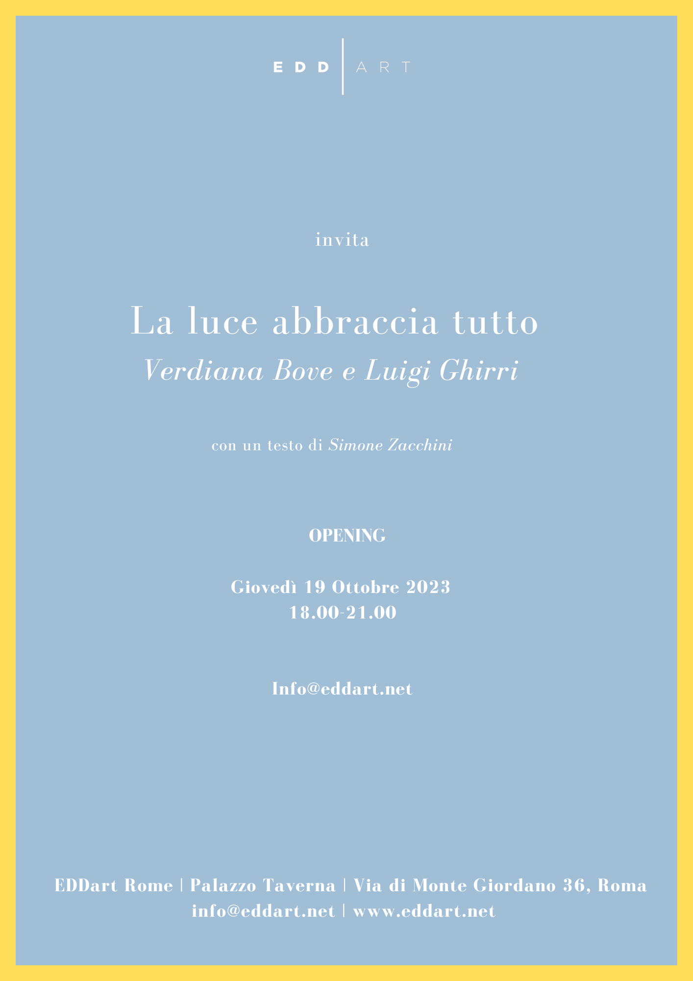 EDDart Rome, presenta La Luce abbraccia tutto: Verdiana Bove e Luigi Ghirri, dal 19 Ottobre al 2 Dicembre 2023 a Palazzo Taverna, Roma. Il progetto espositivo è stato pensato come un dialogo tra una selezione di fotografie vintage di Luigi Ghirri e le opere realizzate appositamente da Verdiana Bove.
