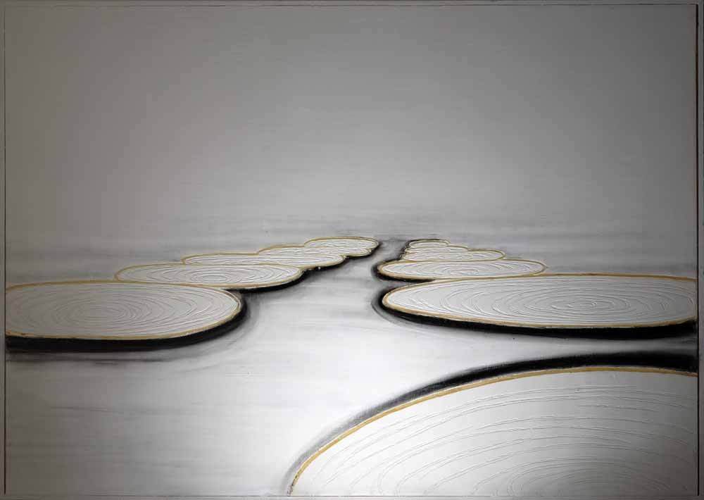 Matteo Ciardini con sapienti e morbide pennellate tratta il paesaggio naturale come specchio cosciente e parlante dell'io umano, dando vita a intimi prologhi, dove forte è la sensazione di un racconto che sta per iniziare. Anche le tele di Paola Maffei sono cariche di tensione emotiva celata dalla donna-diva in pellicce segnata da rosso sangue, da lei trattata e a noi restituita attraverso l'inganno di un'immagine aggraziata e chic dal gusto retrò del bianco-nero ma che svela ad un secondo sguardo tutta la fragilità di un'esistenza sospesa . E la fragilità e l'immobilità di un'esistenza evanescente, ma che resiste all'oblio è palesata anche nelle opere di Francesco Ricci, ancor più sottolineata dai forti contrasti cromatici dove la compattezza delle barriere/sbarre trova la resistenza umana, seppur fragile, intenta a proteggere il suo spazio vitale. Se la Marchionni con le sue pitto-sculture incide nell'imprimitura di gesso soggetti a motivo ritual-circolare con forti rimandi a figure archetipe e arcaiche di importante pregnanza culturale, testimoni di un tempo originario, mitico, ma ancora esistente, la Robalo invece ritrae oggetti del mondo femminile sospesi, leggeri in un luogo senza identità immerse in un'atmosfera onirica, forse in attesa del ritorno di un corpo, o di un osservatore che li ammiri come reliquie. Un corpo presente e allo stesso tempo sfuggente nelle tele di Antonio Sidibè, dei “frame” di vita quotidiana, bloccati dallo scatto fotografico prima e liberati in movimenti leggeri e fluidi dal colore ad olio poi..il movimento a rallentatore di un ideale tempo dilatato genera scie di luce che rende torbida l'immagine...ma è possibile vedere il lato oscuro della luna?