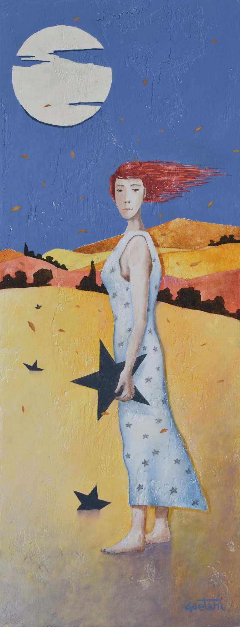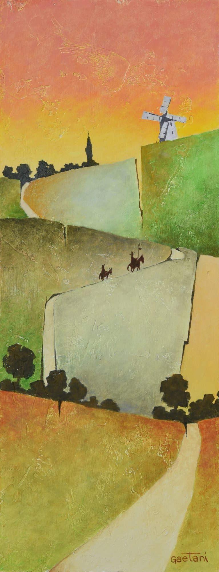 La pittura di Gaetani è un dialogo costante tra luci e spazi, tra colori che si rincorrono e si sovrappongono. Talvolta è il colore stesso a dominare la scena, come nei paesaggi narrati attraverso combinazioni cromatiche. Altre volte, invece, è la forma a imporsi precisa e tangibile, per poi essere trasportata in un mondo di atmosfere quasi metafisiche.
