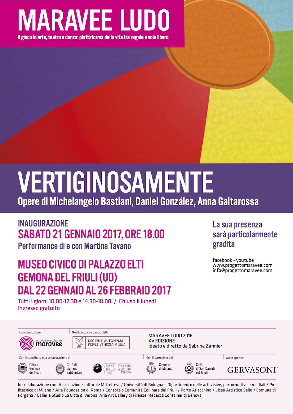 Verrà inaugurata sabato 21 gennaio 2017 alle ore 18 al Museo Civico di Palazzo Elti a Gemona del Friuli (Ud) la mostra “Vertiginosamente” - quarta tappa di Maravee Ludo, XV edizione del festival ideato e organizzato da Sabrina Zannier - con lavori di Daniel González, Michelangelo Bastiani, Anna Galtarossa e una performance di danza-mimo di Martina Tavano.