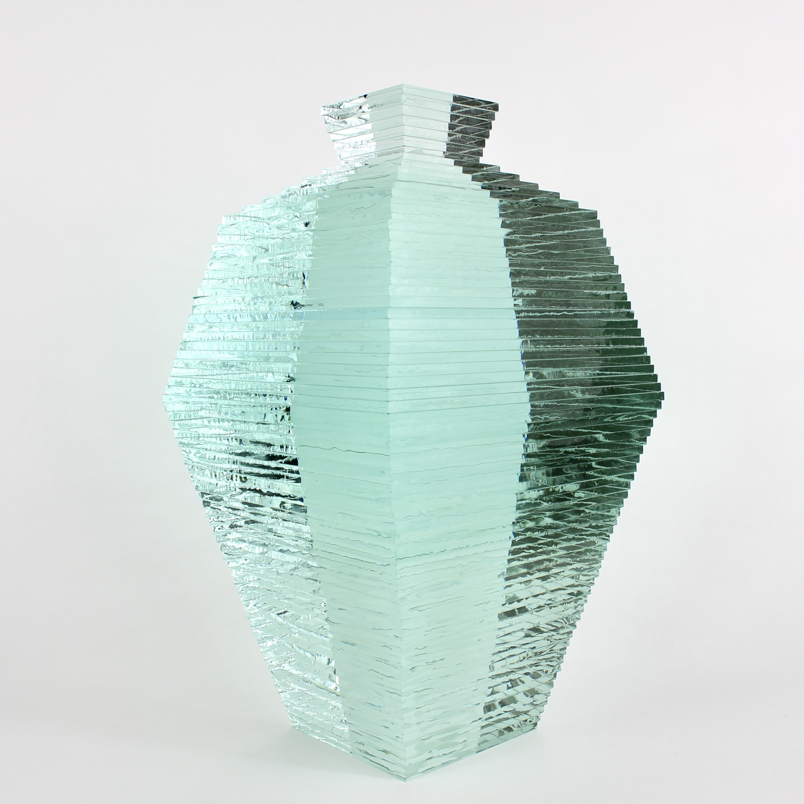 Passando al vetro, le opere di Ōki Izumi si caratterizzano per il colore verde-azzurro, effetto che richiama gli elementi dell’acqua e dell’aria cari alla cultura nipponica. Stratificando verticalmente le varie lastre di vetro industriale le une sulle altre, l’artista dà forma a vasi trasparenti in cui lo sguardo dell’osservatore attraversa le superfici e in base al variare della luce suscitano differenti impressioni e stati d’animo. Nei vasi di Izumi, sospesi tra visibile e invisibile, aleggia un alone di enigmaticità nella quale l’artista esorta il fruitore a cercare una personale interpretazione.