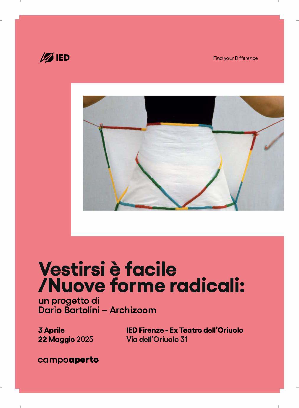 Dal 3 aprile al 22 maggio a IED Firenze-exTeatro dell’Oriuolo la mostra “Vestirsi è facile / Nuove forme radicali”: un progetto di Dario Bartolini – Archizoom”. E’ il primo appuntamento di “Campo Aperto” una piattaforma promossa da IED Firenze che apre alla città l’ex Teatro.