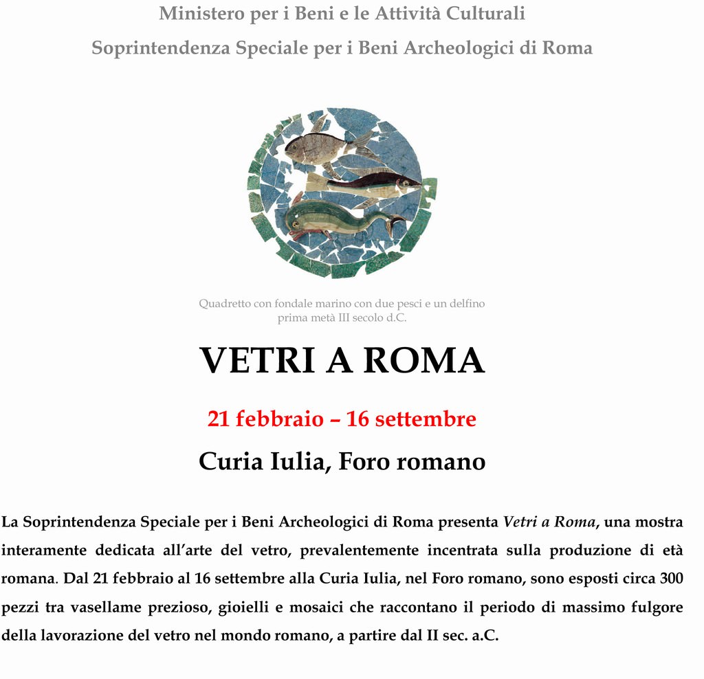 La Soprintendenza Speciale per i Beni Archeologici di Roma presenta Vetri a Roma, una mostra interamente dedicata all’arte del vetro, prevalentemente incentrata sulla produzione di età romana. Dal 21 febbraio al 16 settembre alla Curia Iulia, nel Foro romano, sono esposti circa 300 pezzi tra vasellame prezioso, gioielli e mosaici, che raccontano il periodo di massimo fulgore della lavorazione del vetro nel mondo romano, a partire dal II sec. a.C..