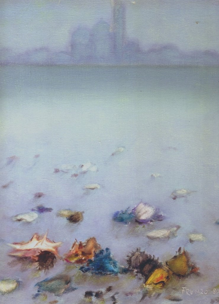 D’ Artista”, messe a disposizione dalla Cassa di Risparmio di Savona, alcuni “omaggi” all’arte, alla personalità di alcuni Artisti veri Maestri dell’arte del Novecento. La Dr.ssa Silvia Bottaro che organizza tale iniziativa ha voluto collocare Vincenzo FRUNZO (La Spezia, 1910 – Roma, 1999), promotore nel 1948 a La Spezia del Gruppo dei Sette. Negli anni Cinquanta del secolo scorso aderì al Movimento Arte Concreta (MAC) e nel 1951 partecipò alla mostra dell’Arte Astratta e Concreta, svoltasi alla Galleria d’Arte Moderna di Roma. Nel 1950 e 1958 partecipò alla Biennale di Venezia e dal 1959 al 1965 fu presente alla Quadriennale di Roma. Ha iniziato ad esporre dal 1930. Nel 1949 venne premiato alla Mostra del Golfo di La Spezia e tra i numerosi premi e riconoscimenti ricordiamo quello del 1970 Primo Premio “Città d’Imperia”. Lavorò a Milano e partecipò a numerose iniziative artistiche significative liguri e non solo. Sentì la lezione di Renato Birolli, abbandonando la pittura dell’area informale, per giungere ad una figurazione con accenti lirico- naturalista molto personale, con una attenzione particolare ai paesaggi (si rammentano la sua Inezia), le nature morte (le conchiglie, gli ombrelloni), le figure.