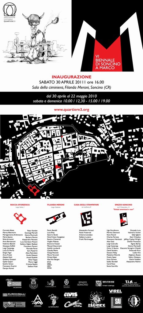 L’Associazione Culturale Quartiere 3 è lieta di informare che la VI Biennale di Soncino, a Marco inaugurerà sabato 30 aprile 2011 alle ore 16.00 presso la Sala della Ciminiera dell’ex Filanda Meroni di Soncino.