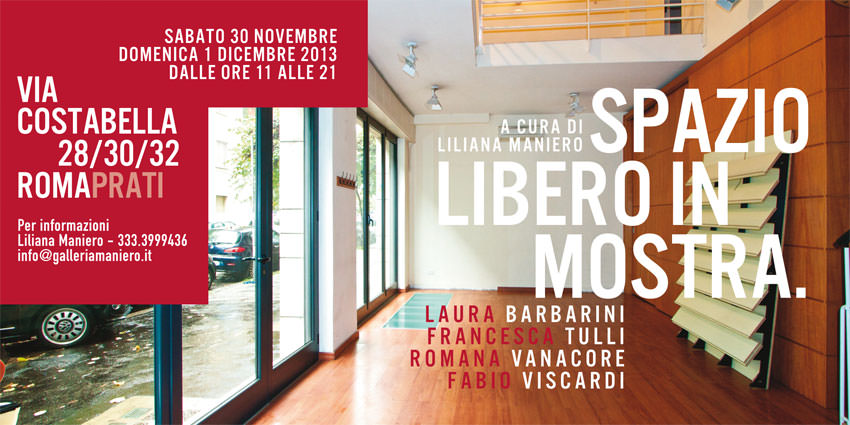 A via Costabella 28, in zona Prati, quasi in angolo col lungotevere della Vittoria, in un locale vuoto, ex sede dell’ Istituto Culturale Ceco, messo a disposizione da un amico, nel frattempo che si venda o si affitti, Liliana Maniero organizza la mostra collettiva Via Costabella 28/30/32. Spazio libero in mostra con gli artisti Laura Barbarini, Francesca Tulli, Romana Vanacore e Fabio Viscardi.