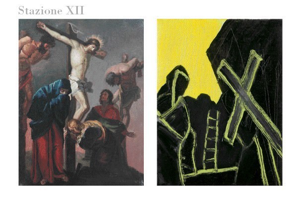 Il percorso della Via Crucis si sviluppa offrendo una lettura parallela,religiosa e umana,delle sue 14 stazioni.Da un lato le tavole del settecento,a fianco di ognuna,nello stesso formato (40 x 30 cm ),stazione dopo stazione,la riscrittura di 14 artisti contemporanei che si sono espressi liberamente attraverso i grandi temi – dolore,morte,redenzione – nella narrazione della condizione umana. Non solo un esercizio estetico,nella trasformazione di evento spirituale in fatto artistico,quanto una compartecipazione della storia universale attraverso frammenti delle proprie esperienze individuali. Quattordici contributi contemporanei che danno vita a uno struggente affresco narrativo dell’eterno calvario umano in tutta la sua fragilita’.
