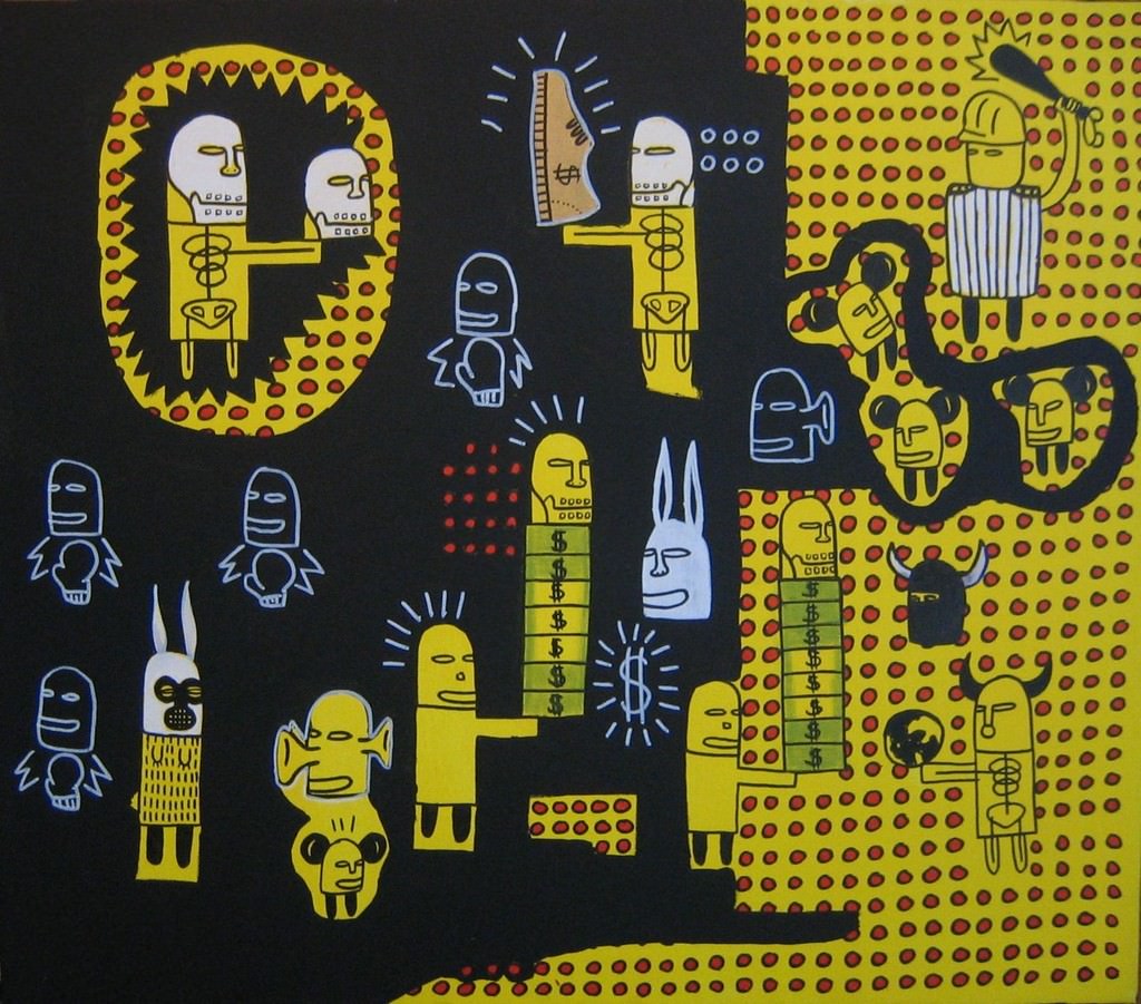 Infine, all’insegna dell’ocra, dell’antracite e del castano, sono le figure indecise di Alessandra Zini, che si contorcono ai limiti di una tavoletta spezzata che ne divide le carni. Il pastello segue le venature del legno descrivendo un andamento sinuoso che solleva dai fondali cupi i corpi filiformi di queste sagome frammentate, che si celano allo sguardo con pesanti maschere di pece, in dittici nati dal nero che, appunto in esso, si risolvono.