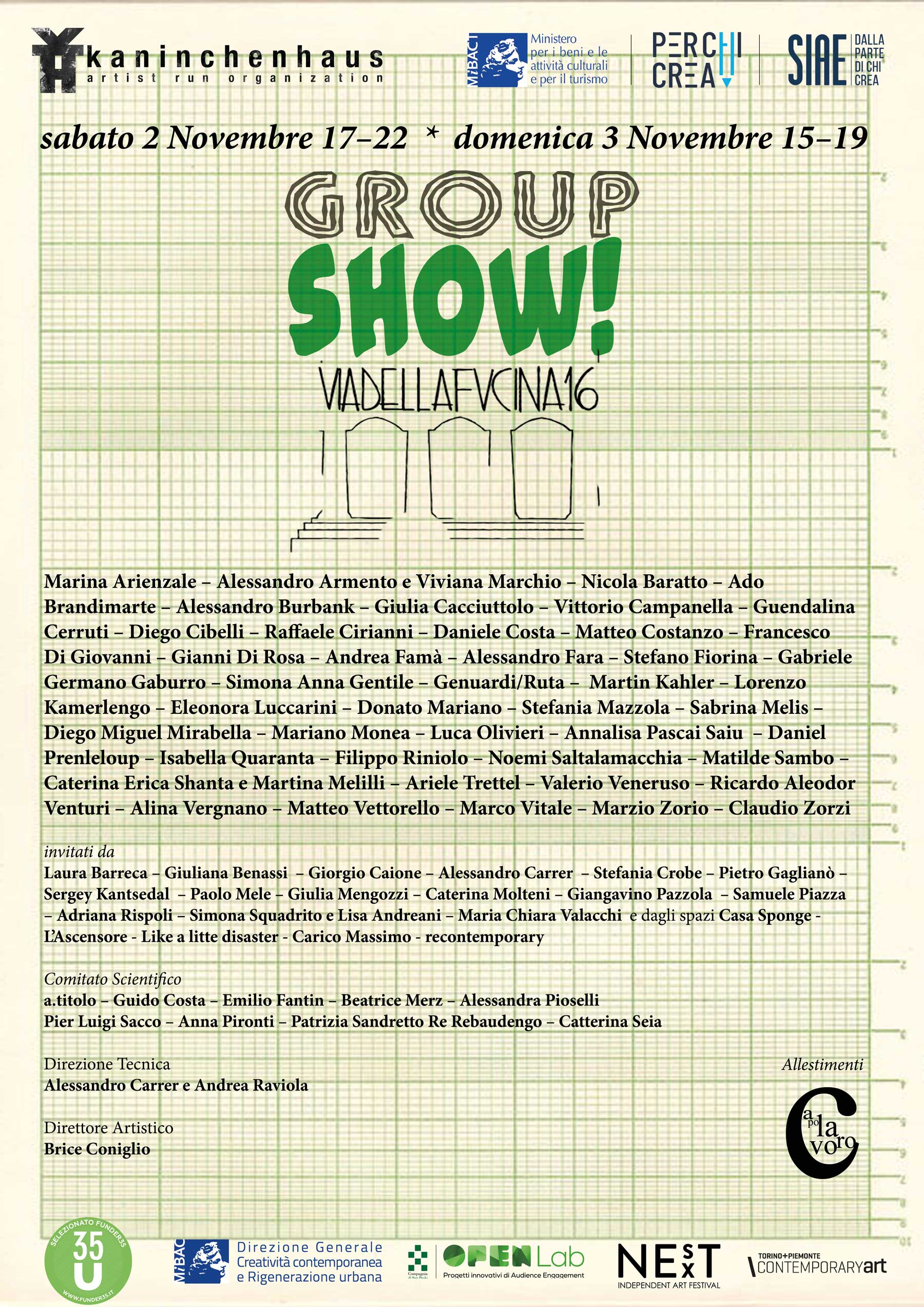 In occasione della Torino artweek e in vista dell’avvio del nuovo ciclo di residenze d’artista in Viadellafucina16 Condominio–Museo, KaninchenHaus è lieta di presentare una collettiva, della durata di due giorni, con opere di 44 giovani artisti italiani invitati a partecipare da 16 curatori attivi su tutto il territorio nazionale.