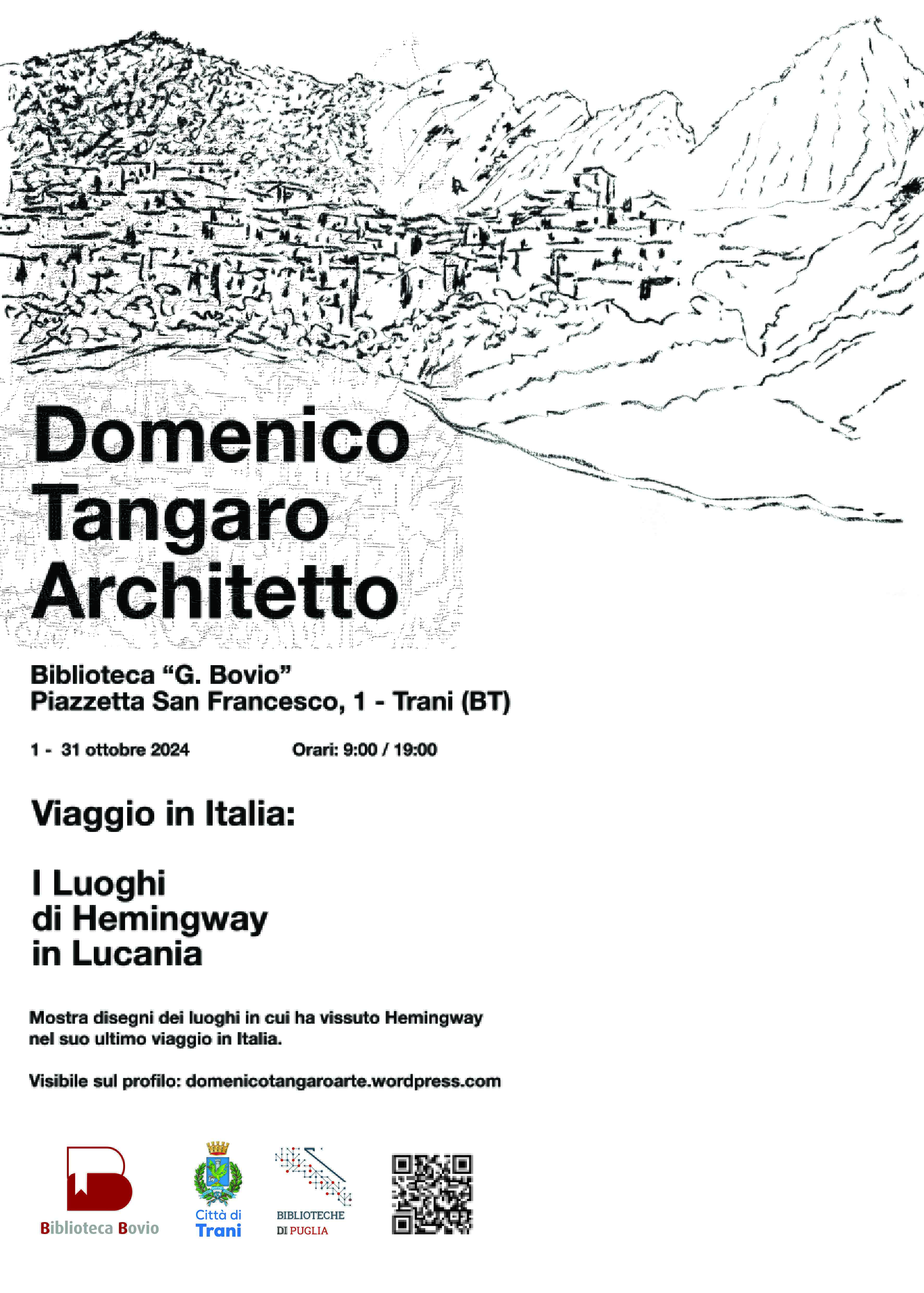 L'Assessorato alle Culture della Città di Trani promuove e invita a visitare la mostra espositiva di disegni dal titolo VIAGGIO IN ITALIA: I LUOGHI DI HEMINGWAY IN LUCANIA realizzati dall' Architetto Domenico Tangaro.