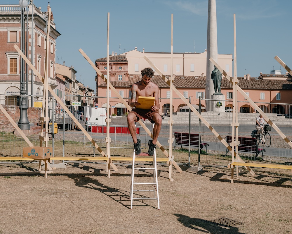 Anche l’allestimento è basato sulla relazione. Curato dal collettivo orizzontale, evita inutili sprechi e riadatta il progetto ideato per la mostra del 2022 Piazze. Fenomenologie dell’inatteso. Entrando in connessione con l’edificio storico, lo riconfigura in spazi e rapporti: i pannelli, come in un album di istantanee, privilegiano l’immediatezza della visione per creare un racconto completo ed esaustivo, mentre la base della parete espositiva si allarga a disegnare una seduta pronta ad accogliere passanti e visitatori, invitandoli ad accomodarsi all’interno dello spazio, che da corte di passaggio diventa luogo di relazione e di approfondimento.