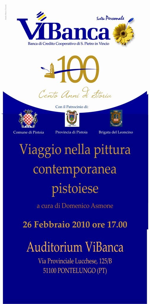 La volontà di percepire alcune delle attuali risultanze creative in tema di pittura a Pistoia, oggi nel 2010, è al centro di questa proposta espositiva promossa dalla ViBanca in occasione del centenario della sua fondazione, che si esplica attraverso l?allestimento di una collettiva introduttiva di presentazione alla quale seguono 14 personali di altrettanti artisti operanti nel territorio pistoiese, tutti in eventi della durata di un giorno con incontro-dibattito all?Auditorium della ViBanca di Pontelungo. Scelta al contempo facile e difficile. Difficile per l'inevitabile esclusione di alcuni, facile per la grande abbondanza di validissimi artisti che Pistoia da sempre elargisce, in una sorta di influenza geografica che forgia a ritmo ininterrotto figure di primo e primissimo piano nell?arte del novecento e contemporanea. Siliano Simoncini in un suo saggio critico sulla «generazione di mezzo» pubblicato nel catalogo «Percorsi della figurazione a Pistoia» edito dal «Centro di documentazione arte moderna contemporanea pistoiese» esordisce specificando che «Pistoia è per vocazione città di artisti». Gli artisti pistoiesi coinvolti in questa importante manifestazione sono in ordine alfabetico: Domenico Asmone, Rossella Baldecchi, Franco Balleri, Franco Cappelli, Mario Caracciolo, Alessandro Ciantelli, Giorgio Giacomelli, Lando Landini, Marcello Lucarelli, Alessandro Marini, Michele Misiano Lastraioli, Cristina Palandri, Paolo Palandri, Aladino Sforzi. Sarà compito degli storici dell?arte e delle personalità che via via presenteranno le personali ( tra i quali, Ugo Barlozzetti, Annamaria Iacuzzi, Ilaria Minghetti, Siliano Simoncini, Maurizio Tuci) addentrarsi in valutazioni critiche, ma è sorprendente cogliere consonanze stilistiche, vicinanze ed attiguità inizialmente insospettabili, in alcuni degli artisti proposti, senza che tuttavia si possa parlare di scuola o linea comune, essendo questi artisti rappresentanti di molteplici e successive generazioni artistiche.