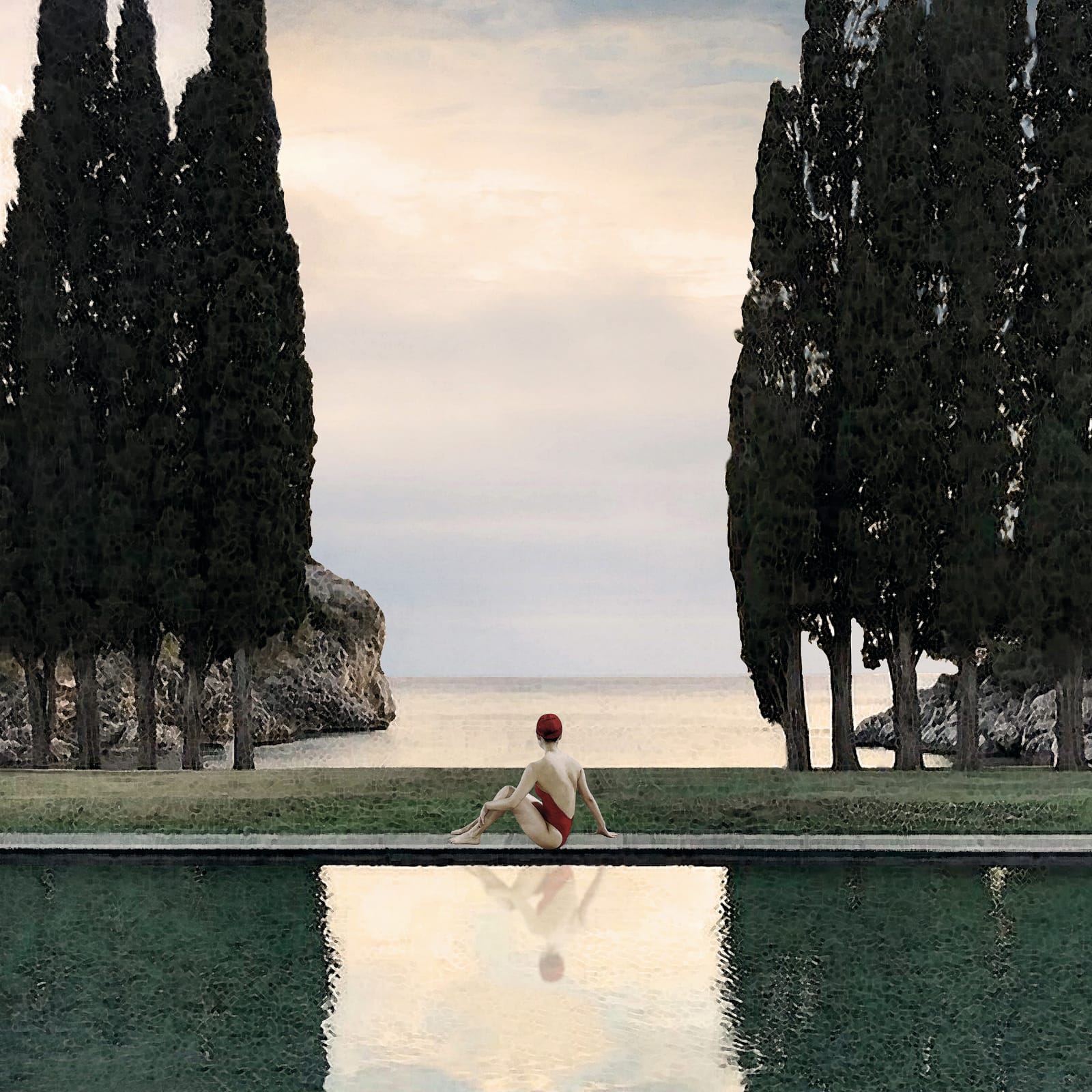 Le composizioni di Aureli si distinguono per un equilibrio sottile tra forma e sostanza. Le figure umane, spesso immerse in paesaggi architettonici sospesi tra irreale e il surreale, appaiono come frammenti di un tempo sospeso, dove il confine tra passato, presente e futuro sembra di dissolversi. La nudità delle figure, lungi dall’essere provocatoria, richiama una purezza primordiale, un ritorno all’essenza dell’essere, in armonia con il cosmo circostante. È evidente come il lavoro sia influenzato dai grandi maestri del passato: il raffinato uso dello spazio e della luce richiama la maestosità di Giovanni Bellini, mentre l’isolamento sospeso delle sue figure sembra un tributo all’universo enigmatico di Edward Hopper. Ma se questi riferimenti sono ben presenti, Aureli li rielabora in una chiave personale, creando una poetica del tutto originale.