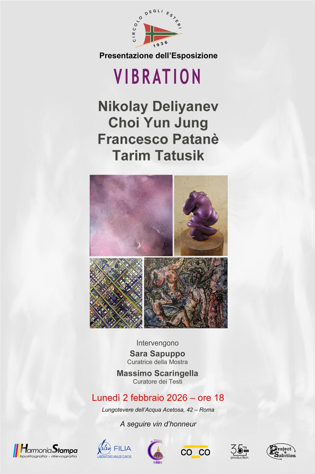 Inaugurerà il prossimo lunedì 2 febbraio 2026, la collettiva “Vibration”, negli spazi del Circolo Affari Esteri di Roma, mostra a cura di Sara Sapuppo con Massimo Scaringella curatore dei testi. In mostra le opere di quattro artisti: la coreana Choi Yun Jung, il bulgaro Nikolay Deliyanev, gli italiani Francesco Patanè e Tarim Tatusik. L’esposizione sarà visitabile fino al prossimo 16 febbraio 2026.