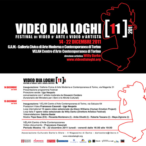 Si inaugura mercoledì 14 dicembre 2011 alle ore 19.00 presso la Sala conferenze della GAM Galleria Civica di Arte Moderna e Contemporanea di Torino – l’undicesima edizione del Festival di video d’arte e video d’artista, Video Dia Loghi (che si trasferisce poi, dal 15 al 22 dicembre presso la galleria Velan Centro Arte Contemporanea in via Saluzzo 64).La manifestazione culturale si presenta affermata da ormai un decennio come un importante momento di divulgazione e di approfondimento critico e storico del linguaggio della “videoarte”. Willy Darko, fondatore e direttore artistico del progetto coadiuvato da alcuni anni dal critico d’arte Giovanni Cordero in occasione dei festeggiamenti dei 150 anni dell’Unità d’Italia lasceranno per un momento l’internazionalità della manifestazione intesa solo nella scelta degli artisti che saranno italiani anziché di altre nazionalità e comunque di fama internazionale consolidata nel tempo. Ugo Nespolo inaugurerà il festival presenziando di persona alla prima serata con un programma di proiezioni video da lui realizzati tra gli anni ‘60 e ’70. Francesco Casorati sarà presente alla galleria Velan durante tutto il periodo della mostra con un Videodocumento realizzato da Willy Darko sulle sue opere più recenti. In mostra opere fotografiche di giovani artisti torinesi e non mancherà in questa edizione la sezione LOOP : vetrina per artisti emergenti provenienti da tutta l’Italia. Il festival manterrà comunque il suo carattere ormai consolidato di internazionalità fornendo un’ampia panoramica sul sistema molteplice e complesso che va dalla “videoarte” dei primi anni Sessanta, alle videoinstallazioni, ai videoclip, alla video documentazione e alla video danza, senza trascurare i fenomeni più recenti, come i video realizzati col telefonino: sezione LOOP International, sezione pensata per questa edizione per inserire nel programma artisti provenienti da tutti i paesi del mondo, questo per mantenere l’internazionalità della manifestazione nonostante questa undicesima edizione sia improntata su opere video di artisti italiani per i 150 dell’Unità d’Italia.