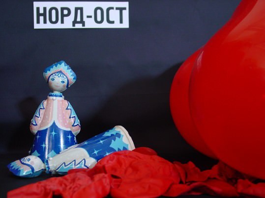 “Nord Ost” è un video di breve durata che racconta attraverso il linguaggio semplice delle favole un tragico episodio che solo alla fine viene svelato. Il video è realizzato con oggetti ripresi dal mondo infantile che, in questo caso, sono carichi di significato simbolico ma di immediata comprensione. Due bambole russe sono, simboli portatori della tradizione, si muovono con meccanismi automatici mentre dei palloncini a forma di cuore, rossi come il sangue, invadono lo spazio fino a soffocarlo portandolo alla distruzione. I suoni di sottofondo sono veri, registrati da una realtà diversa, anch’essa drammatica, tale da porre in stretta relazione mondi differenti fino a un totale coinvolgimento e proporre la narrazione da un punto di vista nuovo. Per Florence le immagini in movimento cominciano sempre da scatti fotografici che in quest’occasione completano l’installazione quasi a voler innalzare un monumento alla memoria.