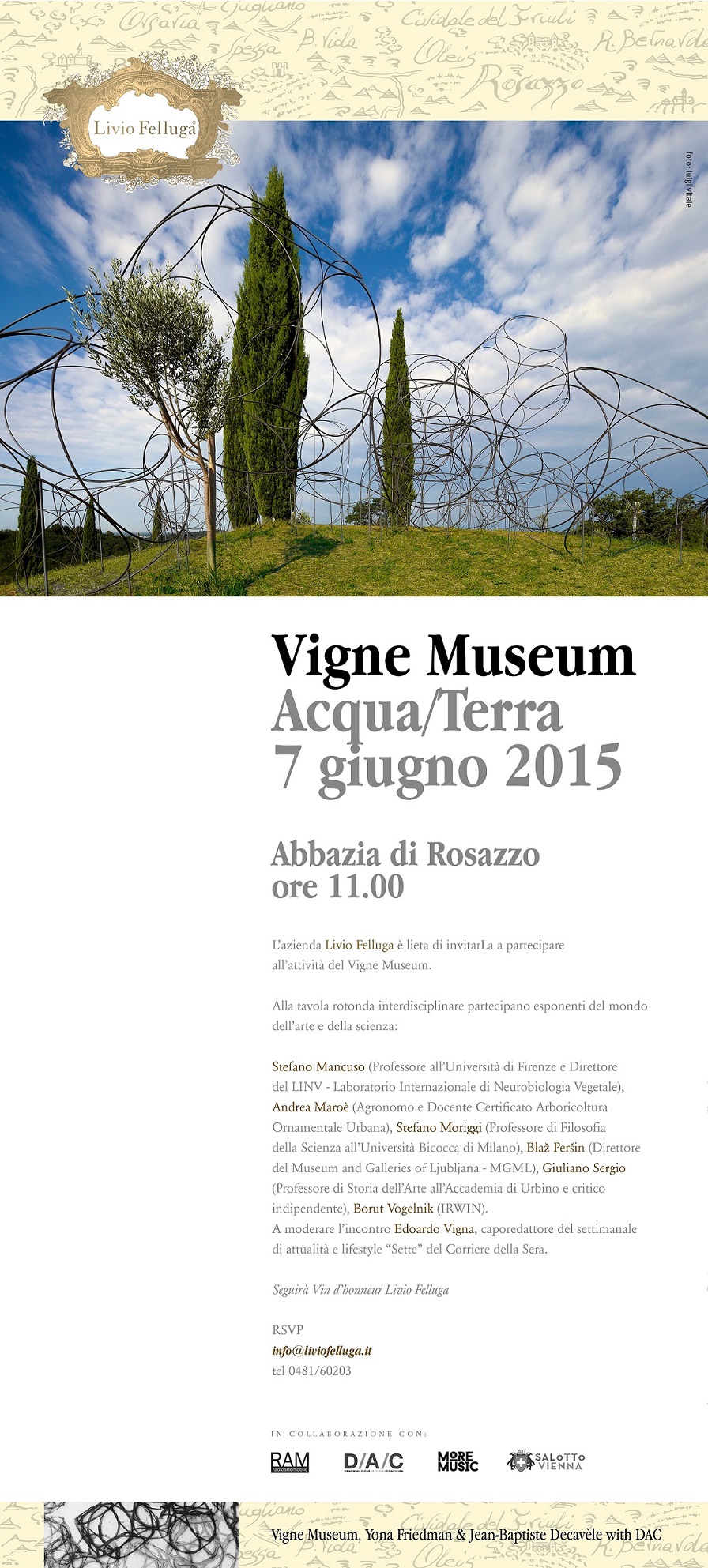 I lavori avranno inizio la domenica mattina alle ore 11 nella sala conferenze dell’Abbazia di Rosazzo, a pochi metri dall’installazione di Friedman/Decavèle, con una tavola rotonda interdisciplinare alla quale prenderanno parte molte personalità del mondo dell’arte, della scienza e della cultura fra cui IRWIN (collettivo di artisti sloveni attivi dal 1983 e conosciuti a livello mondiale), Stefano Mancuso (Professore all’Università di Firenze e direttore del LINV - Laboratorio Internazionale di Neurobiologia Vegetale), Andrea Maroè (Agronomo, Docente Certificato Arboricoltura Ornamentale Urbana, Istruttore Master Treeclimbing), Stefano Moriggi (professore di Filosofia della scienza all’Università Bicocca di Milano), Blaž Peršin (Direttore del Museum and Galleries of Ljubljana - MGML) e Giuliano Sergio (critico e curatore indipendente, professore di storia dell’arte all’Accademia di Urbino). A moderare l’incontro Edoardo Vigna, caporedattore del settimanale di attualità e lifestyle Sette del Corriere della Sera. Ad introdurre il tema dell’ acqua due importanti progetti: il “Project Water” che Lubiana inaugurerà a giugno 2015 in veste di European Green Capital e il rivoluzionario “Jellyfish Barge” condotto dall’LINV candidato al premio delle Nazioni Unite “UNECE Ideas for Change Award” e progetto di punta di EXPO 2015. Acqua quindi come argomento di rilevanza mondiale, come risorsa di vita per il pianeta. Terra perché elemento cardine su cui si basa il Vigne Museum. Terra come agricoltura, come base del sostentamento, come ecosistema e in modo più allargato, come territorio da tutelare e salvaguardare.