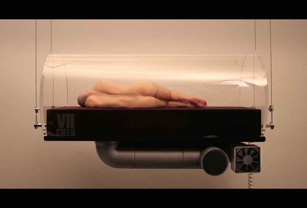 L’installazione si compone di una camera chiusa, ambiente iperbarico, dai perimetri trasparenti che proteggono al suo interno la vita umana. Il corpo umano, sdraiato a terra, è il punto focale della composizione: il suo respiro -generato da un meccanismo di ventilazione che filtra l’aria dall’esterno per portare all’interno tutti i movimenti e i meccanismi della respirazione- sarà l’unione e la continuità tra vita interna e realtà esterna.