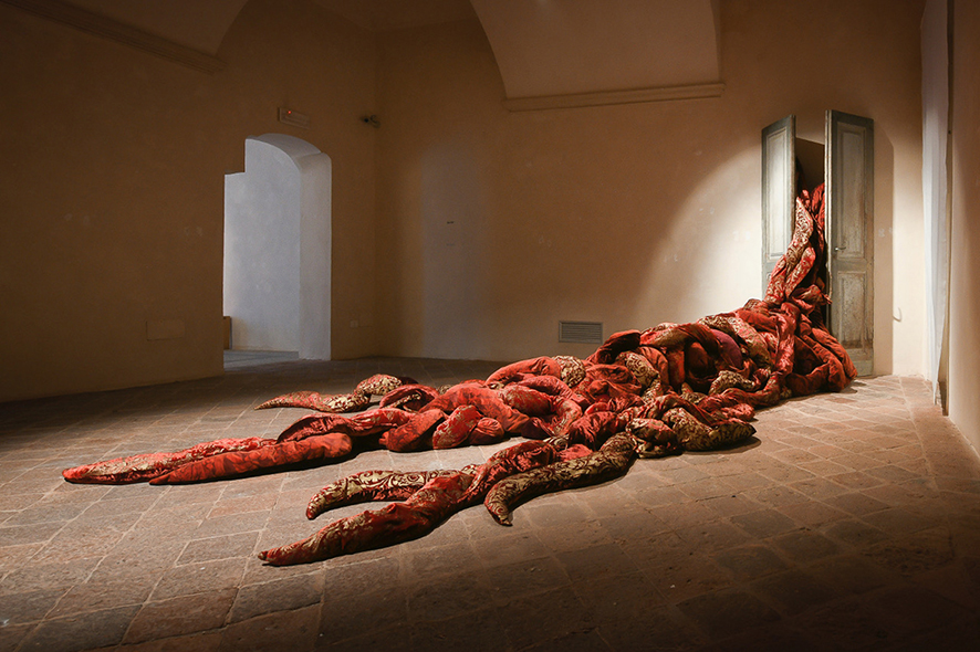 “Mistico primitivo. Elizabeth Aro” è il titolo della terza mostra che prende in prestito lo stile e i versi della poetessa americana Mary Oliver (Primitivo Americano, Einaudi, 2023), a cura di Irene Finiguerra. La ricerca artistica di Aro collega il mondo naturale e umano con l’utilizzo di tessuti pregiati. Negli ultimi anni ha prodotto un gruppo di opere incentrate sulla circolazione del sangue e sul modo in cui l’energia viaggia attraverso il corpo, costruendo una mappa che descrive le strutture dietro i flussi vitali.