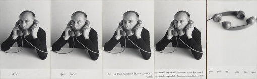 Tra le opere più note di Agnetti presenti in mostra si segnala Autotelefonata (yes) del 1972, in cui in una sequenza fotografica l’artista porge le orecchie contemporaneamente a due cornette, che nell’ultima immagine comunicano direttamente tra loro, quasi a richiamare l’inutilità dell’individuo nel sistema di potere cui è asservito.