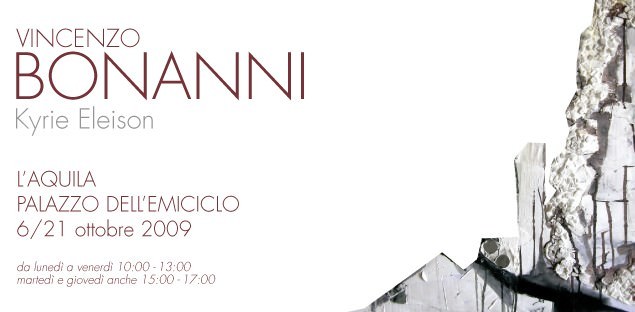 Dopo aver partecipato di recente, ad eventi costituiti al fine di contribuire alla ricostruzione della città dell’Aquila: il World Heritage day, con la presentazione della performance di video-art “Ventidue – 22” tenutasi a Dresda lo scorso giugno e la Art for L’Aquila, mostra e asta organizzata dalla Art Project Minerva svoltasi a Londra in giugno-luglio, il pittore aquilano Vincenzo Bonanni presenta, in prima, a L’Aquila la sua ultima collezione dal titolo Kyrie Eleison. Il nuovo lavoro sulla città e per la città, nato nei mesi successivi al sisma, comprende undici opere di medie e grandi dimensioni. La loro realizzazione vede l’uso di tecnica mista sia su compensato che su cartone intelaiato. E’ con la scelta di quest’ultimo materiale che l’artista ha voluto trasmettere il senso della precarietà e della instabilità laddove la sovrapposizione materia denuncia il peso delle strutture sulla mutabilità: del suolo e della vita. Il peso inesorabile del destino.