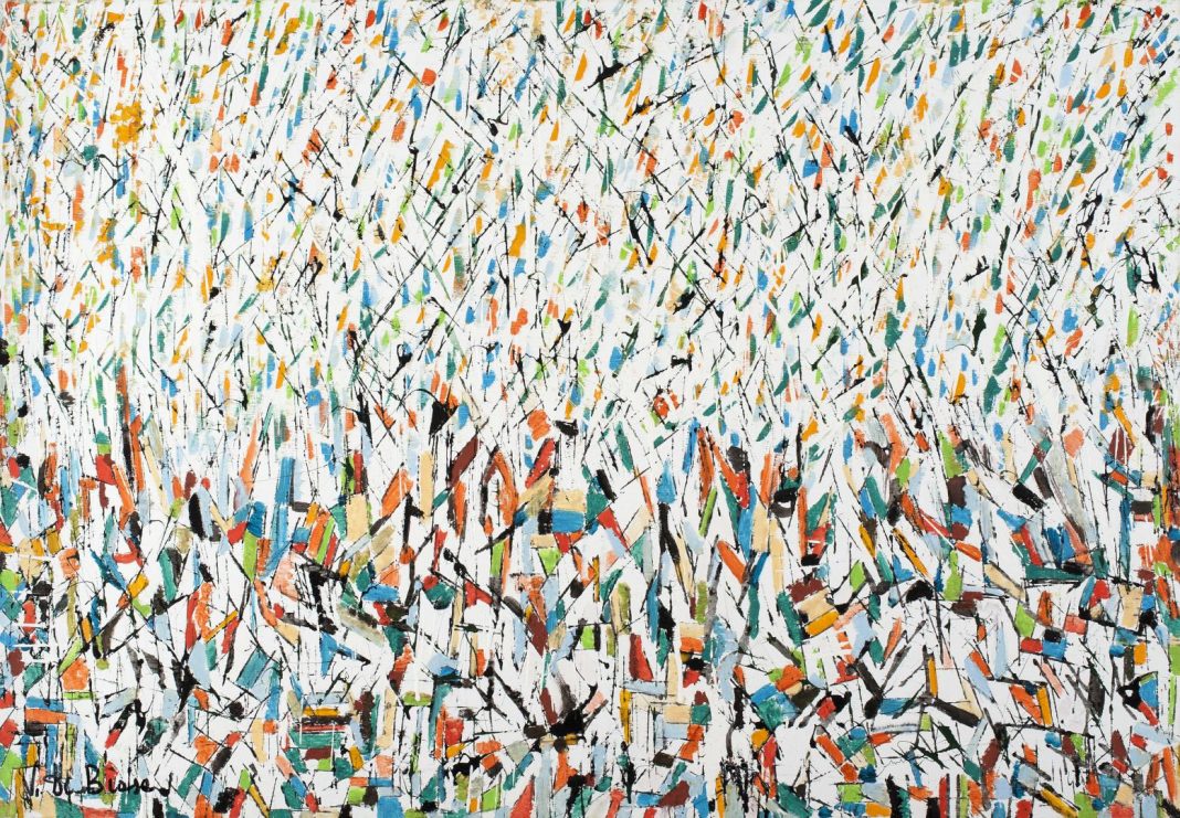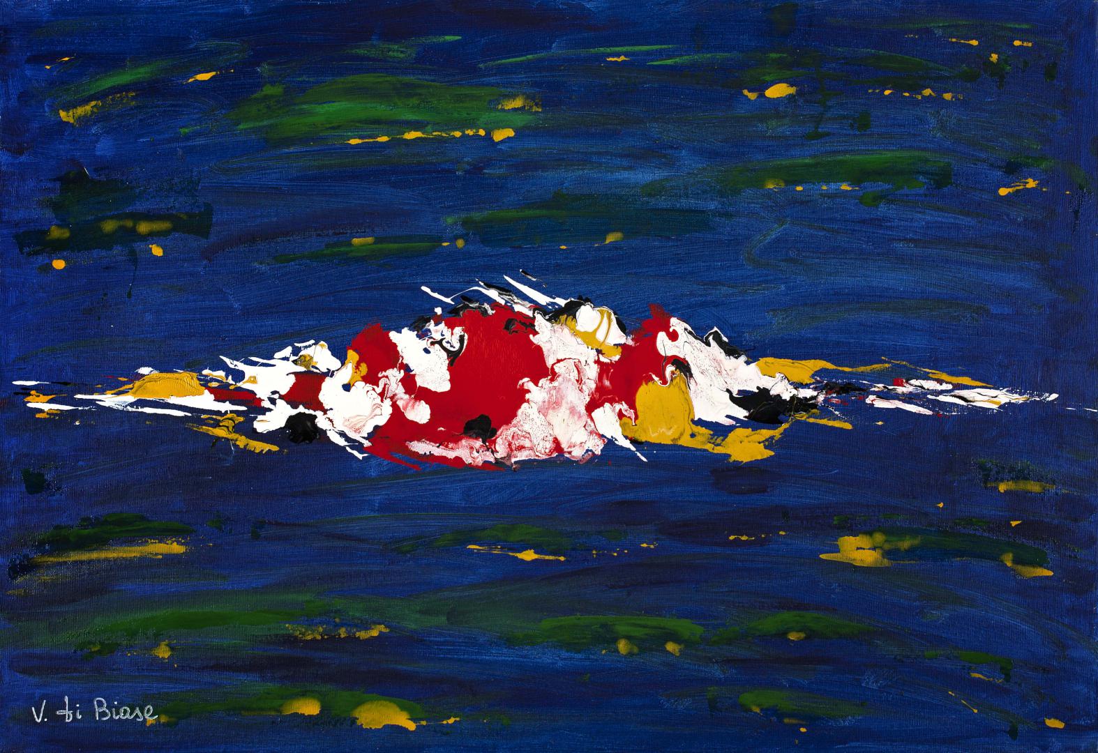 LE OPERE IN MOSTRA – Se il passato di Vincenzo Di Biase poggiava sui manuali di Platone, Eraclito, Newton ed Einstein e il presente su numeri, formule e teoremi contemporanei, il futuro poteva ancora essere riscritto. Con coraggio, passione e con un’incredibile voglia di sperimentare e sperimentarsi, si avvicinò al mondo artistico, fatto di emozioni ed istinti, riuscendo ad alternare il rigore scientifico, la sua strada di sempre alla velleità pittorica, del tutto inedita. Attingendo dai mondi di Kandinsky, Mondrain, Pollock, Tancredi, Corpora e Scialoja, Di Biase ne crea uno inedito, suo, che cresce con lui e per lui, sintesi di processi imitativi, di meccaniche astrattive e di ipnotiche cromazioni.
