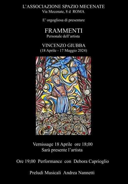 S’inaugura il prossimo 18 aprile alle ore 18, presso lo Spazio Mecenate a Colle Oppio, Roma, la mostra intitolata “Frammenti”, personale dell’artista, designer e architetto Vincenzo Giubba, con perfomance ideata dallo stesso artista che vedrà la partecipazione di Debora Caprioglio e di Andrea Nannetti.
