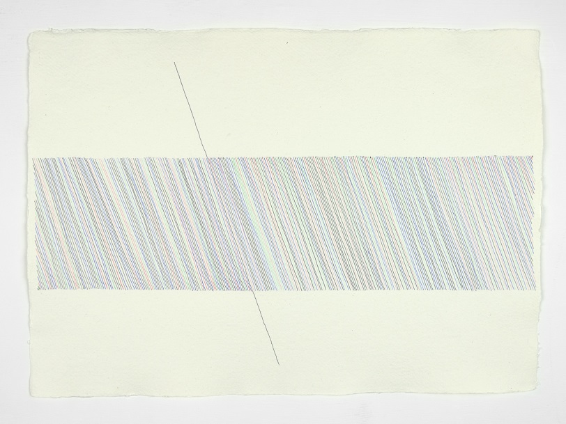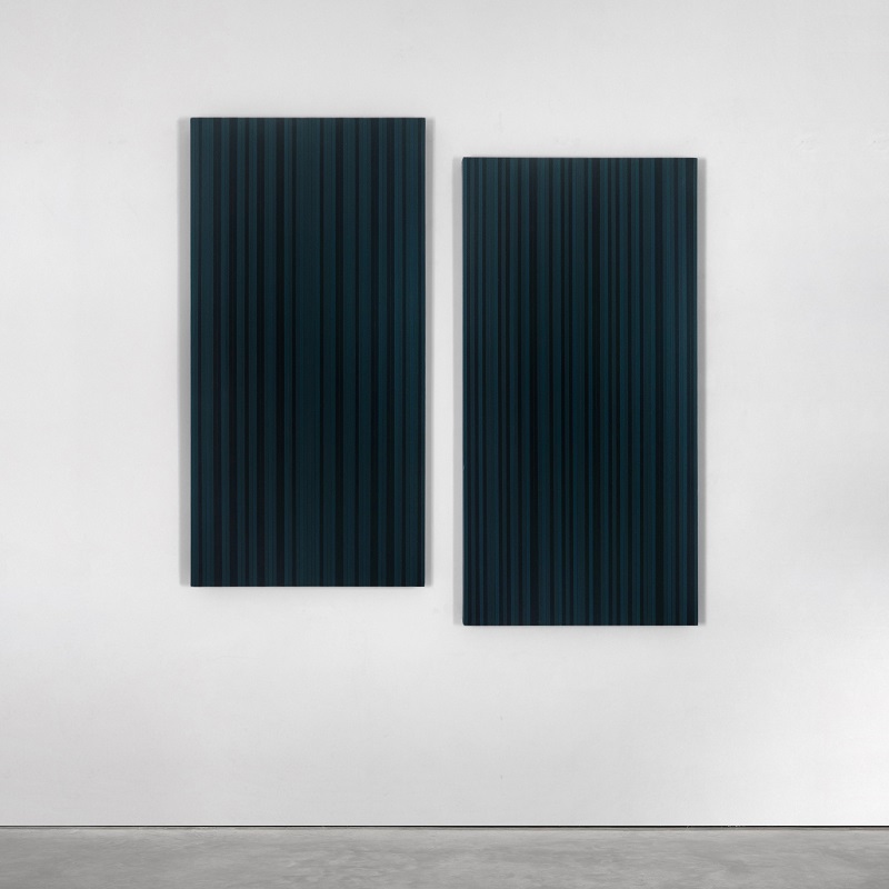 Le opere su tela sono composizioni di linee parallele dipinte secondo uno schema compositivo