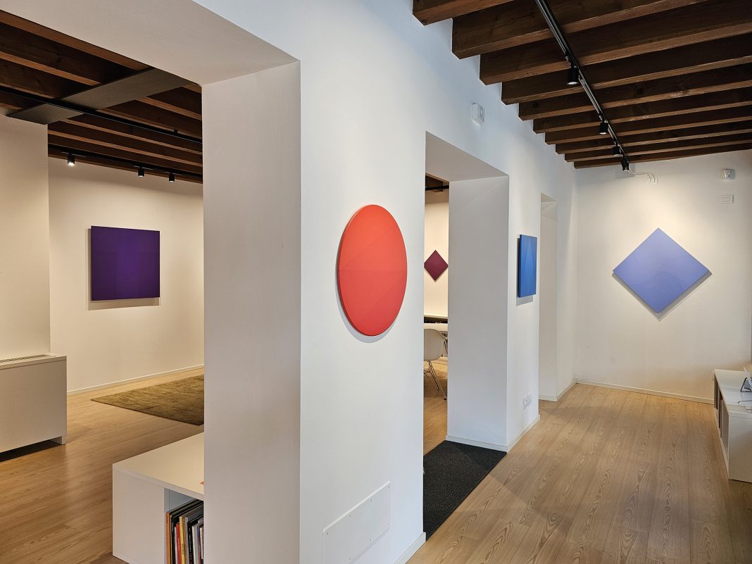 Queste forme geometriche, classiche e riconoscibili, diventano capaci di modificare profondamente dall’interno i sistemi percettivi e le coordinate spaziali, portando lo spettatore verso una decostruzione dello spazio in virtù della luminosità e della grammatura del colore che scardina la stessa forma geometrica, aprendo a un perimetro infinito, lontano dalle categorie del reale.