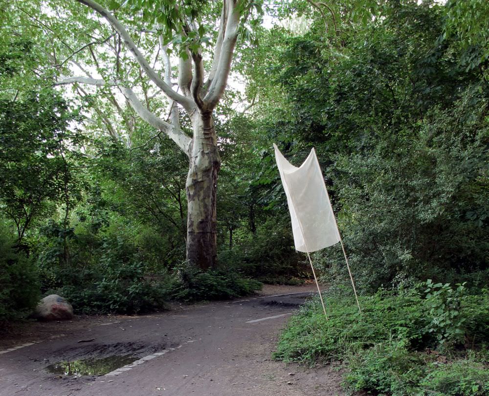Vincenzo Rulli presenta un percorso artistico avviato circa 6 anni fa e che lo ha visto impegnato ciclicamente, seguendo il ritmo naturale delle stagioni, nella raccolta dei fiori di pioppo che cadono dagli alberi nel cuore di grandi città quali Roma e Berlino. Allo scopo l’artista ha realizzato degli strumenti ad hoc, “raccoglitori” formati da coppie di aste che sostengono un tessuto leggero semi trasparente: simili a bandiere o manifesti da corteo, essi sono tuttavia privi dell’utilità oggettiva che contraddistingue gli oggetti usuali del nostro mondo quotidiano e sottraggono lo sguardo all’abitudine sollecitandoci a porre la domanda sul senso stesso.