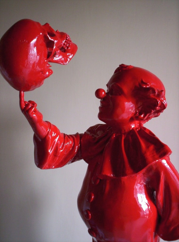 L’artista presenta per questa sua mostra intitolata “ Deadline ” due sculture raffiguranti dei clown che in diversi modi si relazionano con un teschio.