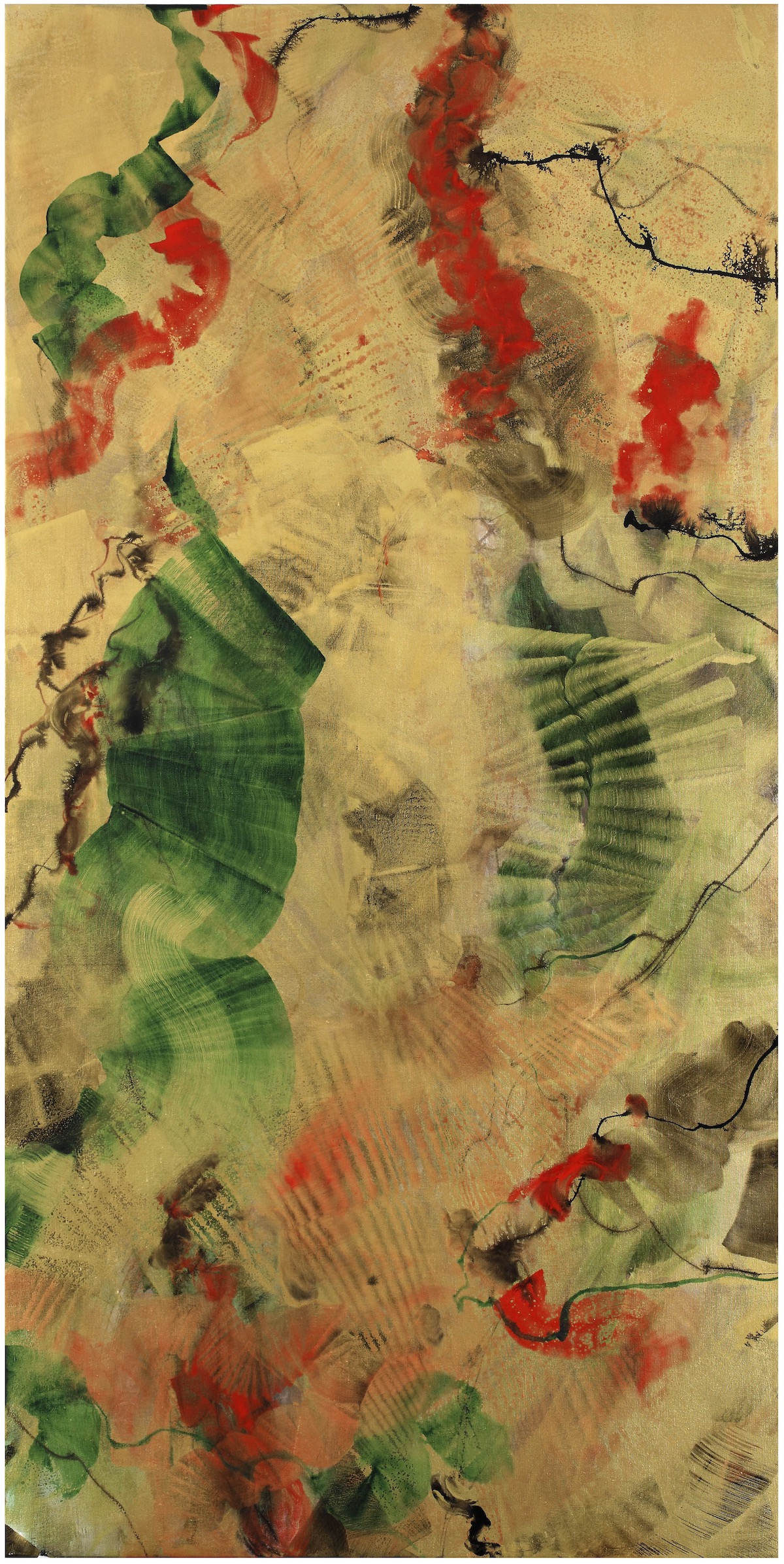 Dall’oro scintillante delle due tele d’ingresso, riacceso in superficie da sventagliate cromatiche rosse e verdi che ne muovono l’aria e ne livellano lo spazio, si passa dunque al folle viaggio attraverso un mondo instabile e misterioso, in cui le forze della natura, pacifiche sul plinto centrale, prendono vita e sconquassano gli animi, al ritmo ondulante delle forme che emergono da un fondo oscuro e ventoso.
