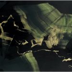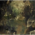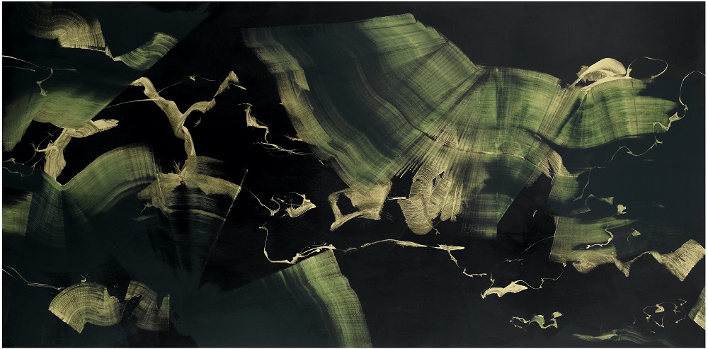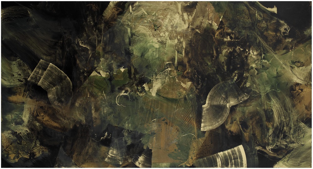 Dalla conca dei colori, come fosse un cratere vulcanico, i verdi, i neri e il color dell’oro attingono dalle onde della meditazione, dal fuoco, dalle arie di antiche musiche, da spartiti del tutto contemporanei, da un non so che di raffinatamente orientale, ma anche dalla terra e dal fango, da radici e rami secchi, da contorti tralci di vite con gli appassiti acini, da rimandi letterari di un profondo e libero pensiero, fondendosi in atmosfere notturne, si imprimono e si svelano sulle larghe campiture accuratamente predisposte, per via di gesti ampi e veloci, ma anche a volte lentissimi, scoprendone la meraviglia contrapposta alla caducità della vita”.