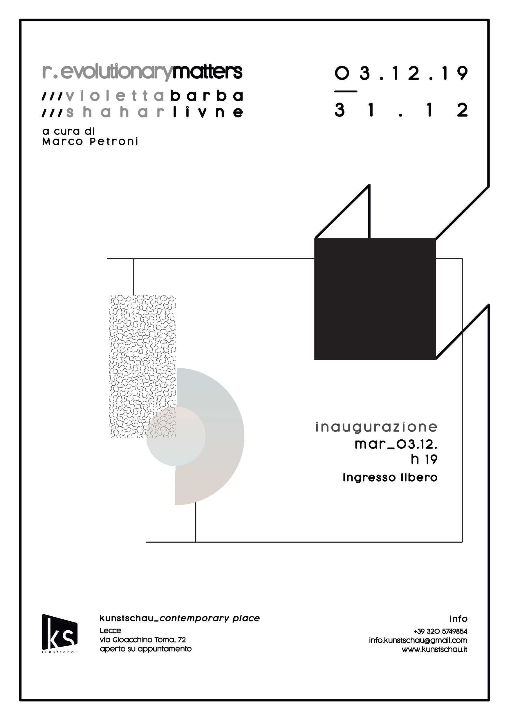 Martedì 3 dicembre 2019 alle ore 19.00, Kunstschau_Contemporary Place a Lecce in via Gioacchino Toma 72, inaugura la mostra R.EVOLUTIONARY MATTERS con i progetti di Violetta Barba e Shahar Livne, a cura di Marco Petroni.