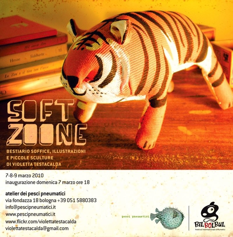 “SoftZOOne” è un piccolo bestiario di stoffa, animali cuciti e imbottiti, illustrazioni-collages a tecnica mista, sculture in legno e carta, animazioni in stop-motion, ma anche una panoramica su come nasce un pupazzo, sul making of dal disegno al cucito, dalla progettazione alla creazione.