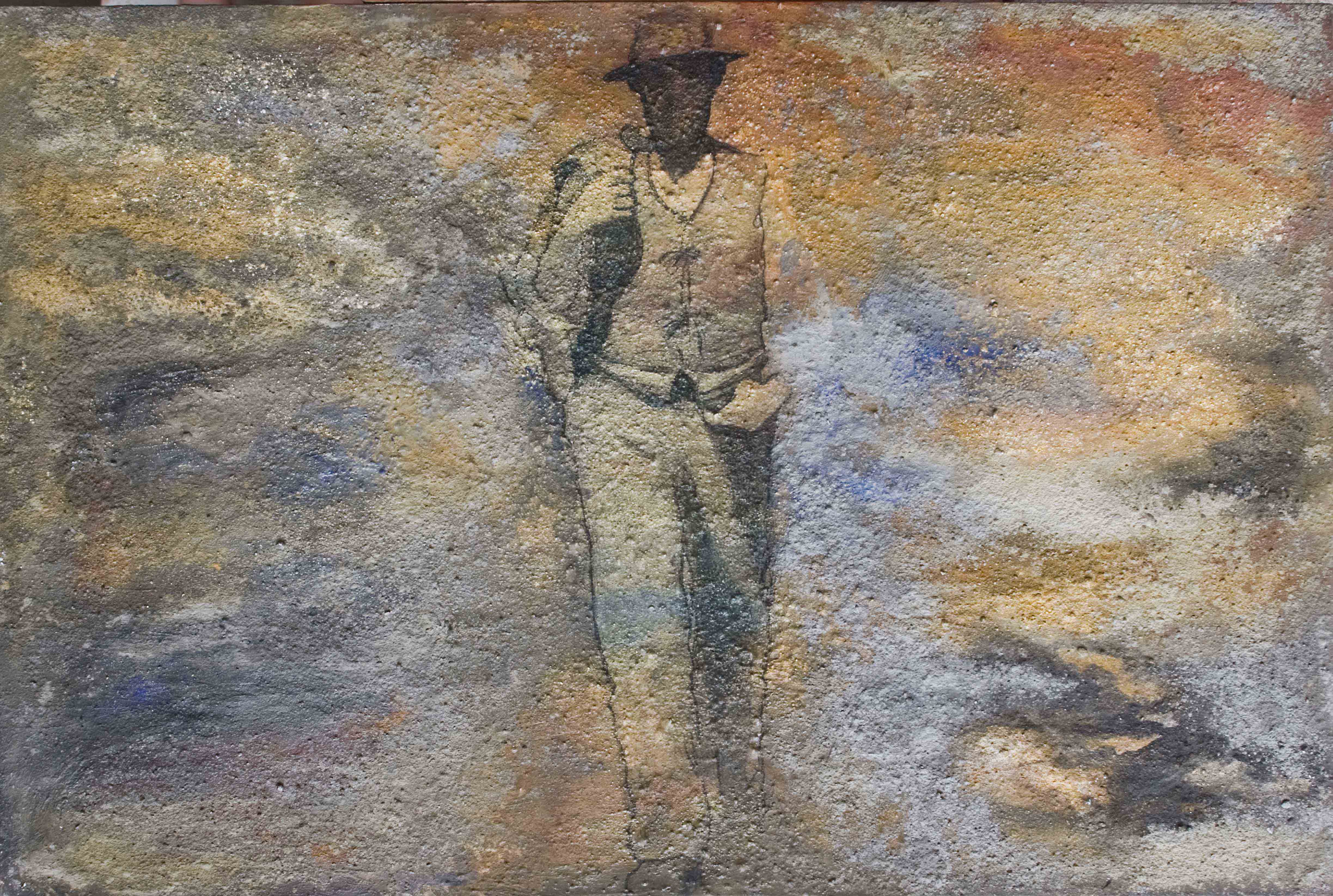 Accanto ad una serie di grandi tele che rivisitano alcune figure del celebre dipinto intitolato “Quarto Stato”, di Pelizza da Volpedo (emblema delle lotte operaie e della coscienza stessa della classe operaia), in chiave sottilmente contemporanea, campeggia una grande installazione che raffigura, simbolicamente, un operaio morto sul lavoro: in un basso parallelepipedo di cemento grigio affondano la maglia i pantaloni e le scarpe di cemento bianco di un povero operaio; attorno a questo cenotafio evocativo delle transenne, anch’esse incrostate di cemento. E di cemento sono fatte anche i fondi delle grandi tele che rappresentano, singolarmente, le figure centrali del celebre dipinto di Pelizza da Volpedo. Ciascun operaio ci appare solo, circondato da nuvole di cemento. Quella che il secolo scorso era una “Fiumana” di cui il singolo operaio si sentiva parte, oramai si è prosciugata. Ognuno è solo nella sua strenua lotta per la sopravvivenza. Perduto ormai ogni senso di comunità, di appartenenza. Il cemento copre ogni cosa. La forza alienante del cemento, correlativo oggettivo dello sfruttamento del lavoro. E dunque il cemento è protagonista: sul cemento si staglia a fatica la figura dell’uomo e di cemento questa figura è fatta, impregnata. Così come è sempre il cemento, materialmente, a fare da base ad una grande croce di cartone ondulato o è il cemento ad incrostare gli abiti o gli strumenti di lavoro appesi. (Guglielmo Nero)
