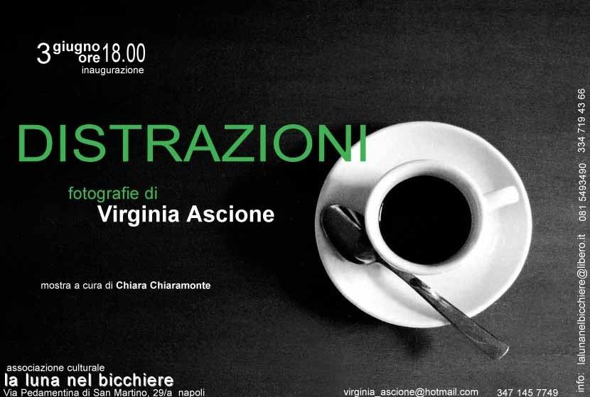 Sabato 3 Giugno 2006 s’ inaugura la personale fotografica Distrazioni di Virginia Ascione presso l’associazione culturale la luna nel bicchiere al 29/a di Via Pedamentina di San Martino a Napoli. Genova, Milano, Londra, Palermo, Parigi, Perugia, Torre del Greco: sono questi i luoghi in cui Virginia Ascione ha scattato le sue fotografie, laddove sia consentito riconoscerne le architetture urbanistiche; talvolta queste si dileguano, facendo posto solo agli oggetti (bottiglie, una tazzina, acqua, fiori, pontili, etc.) fra i quali è possibile rintracciare solo un rimando a quegli scenari o, più spesso, perderlo del tutto.