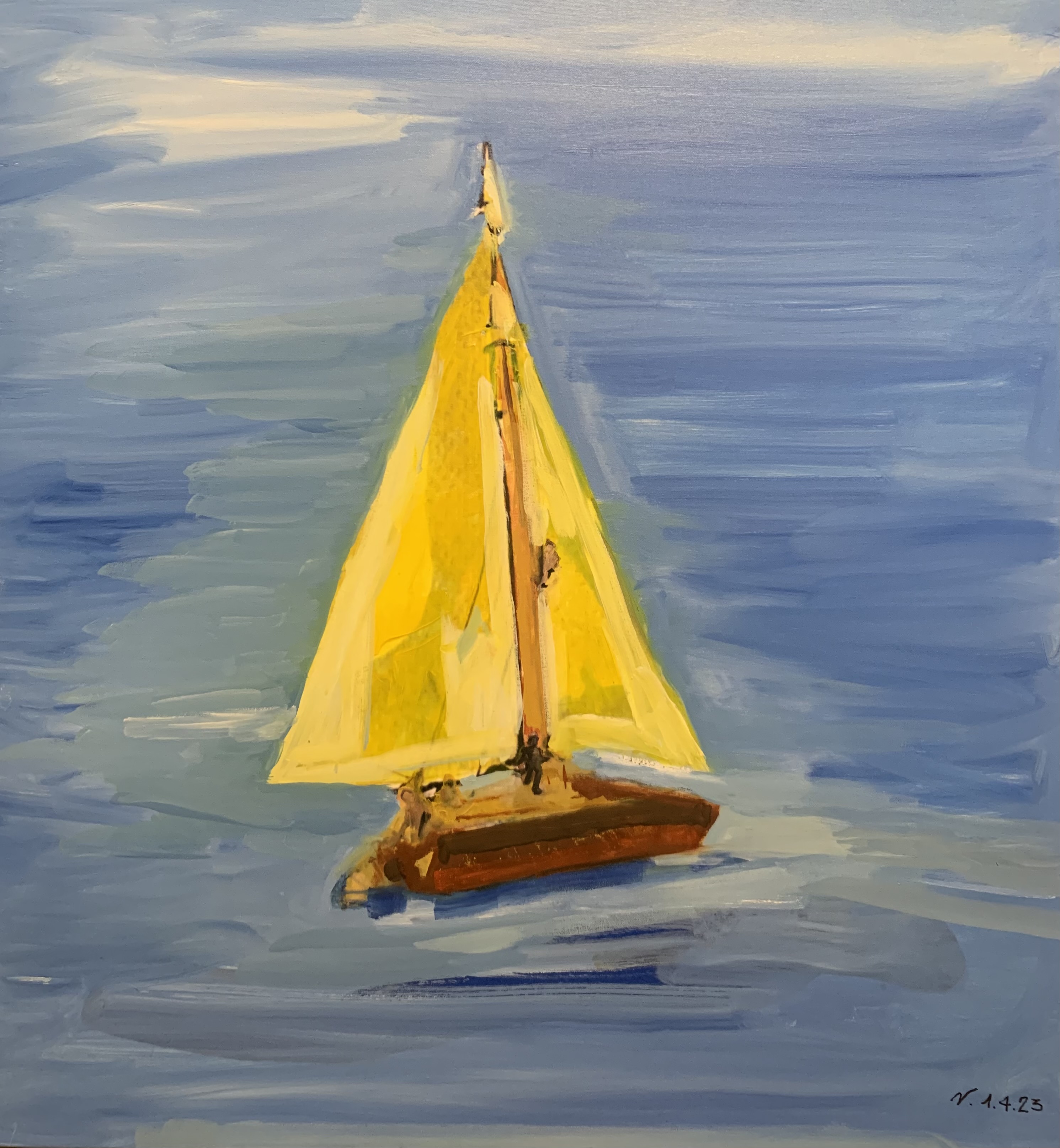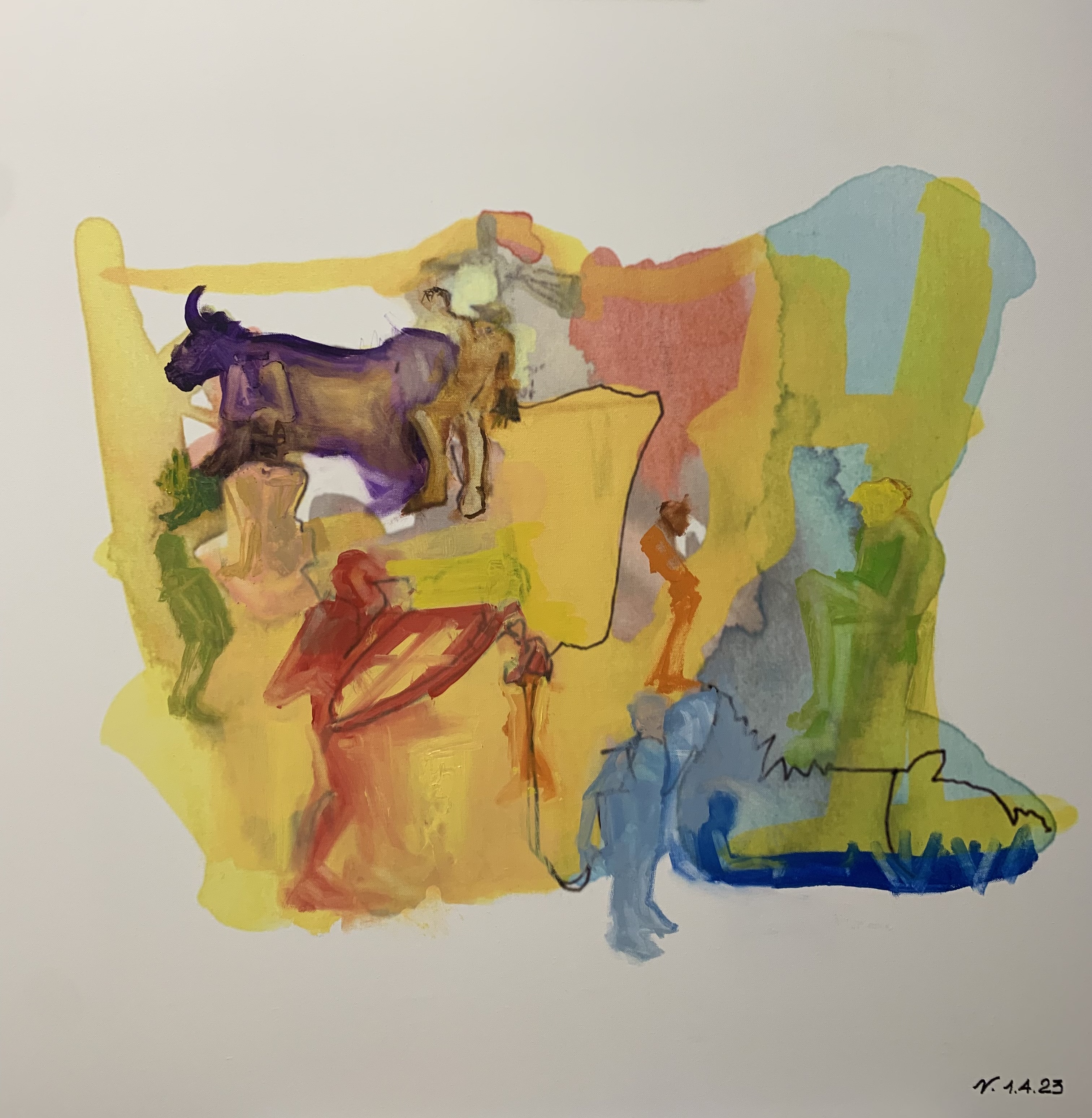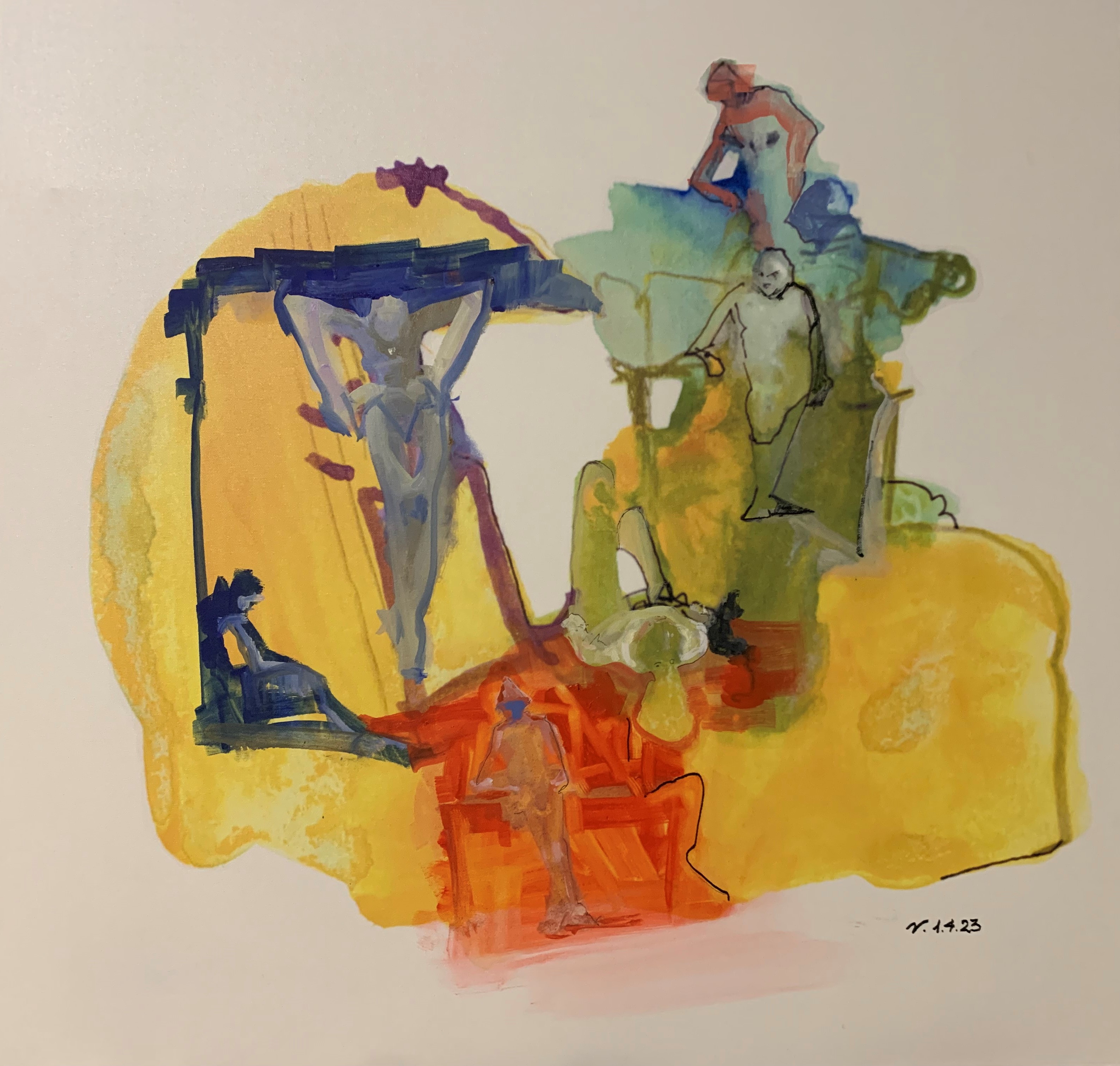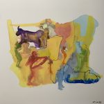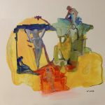 Le sue figure quasi senza identità di genere si compongono di linee tracciate come impressioni, quasi senza peso, eppure sono volume, si muovono in uno spazio fluttuante dove tutto è dinamico, il colore trascina ombre quasi sfatte, ma pulsanti, provocando vere e proprie distorsioni astratte, capaci di esprimere movimento, tecnica, sentimento, il tutto in sintonia con alcune correnti dell’astrattismo novecentesco.