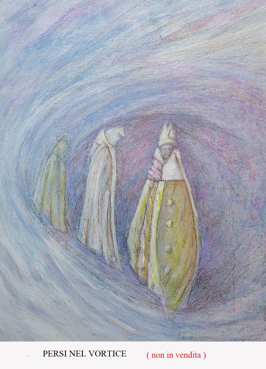 La mostra “Visioni” racchiude alcune delle opere più significative del suo percorso artistico. È una presa di posizione sulla decadenza morale di una certa corrente clericale che viene rappresentata, talvolta senza volto oppure lasciata al di fuori delle mura cittadine. Nei suoi dipinti, che propongono scene tra l’onirico e il fantastico, emergono queste figure intonacate e spesso prive d’identità, vestite solo di involucri preziosi ma stravolte nelle pose e nelle espressioni, rappresentate in scene di magnificienza e solennità, di sfarzi eccessivi, tutti elementi che portano ad un inevitabile declino ideologico, a tratti rappresentato da vortici di colori oppure da paesaggi nudi con chiese e mura che si deformano su stesse. La luna è molto spesso presente nei suoi dipinti e, oltre a rappresentare l’archetipo della trasformazione delle emozioni funge anche da linea di demarcazione che divide il reale dall’ illusorio.