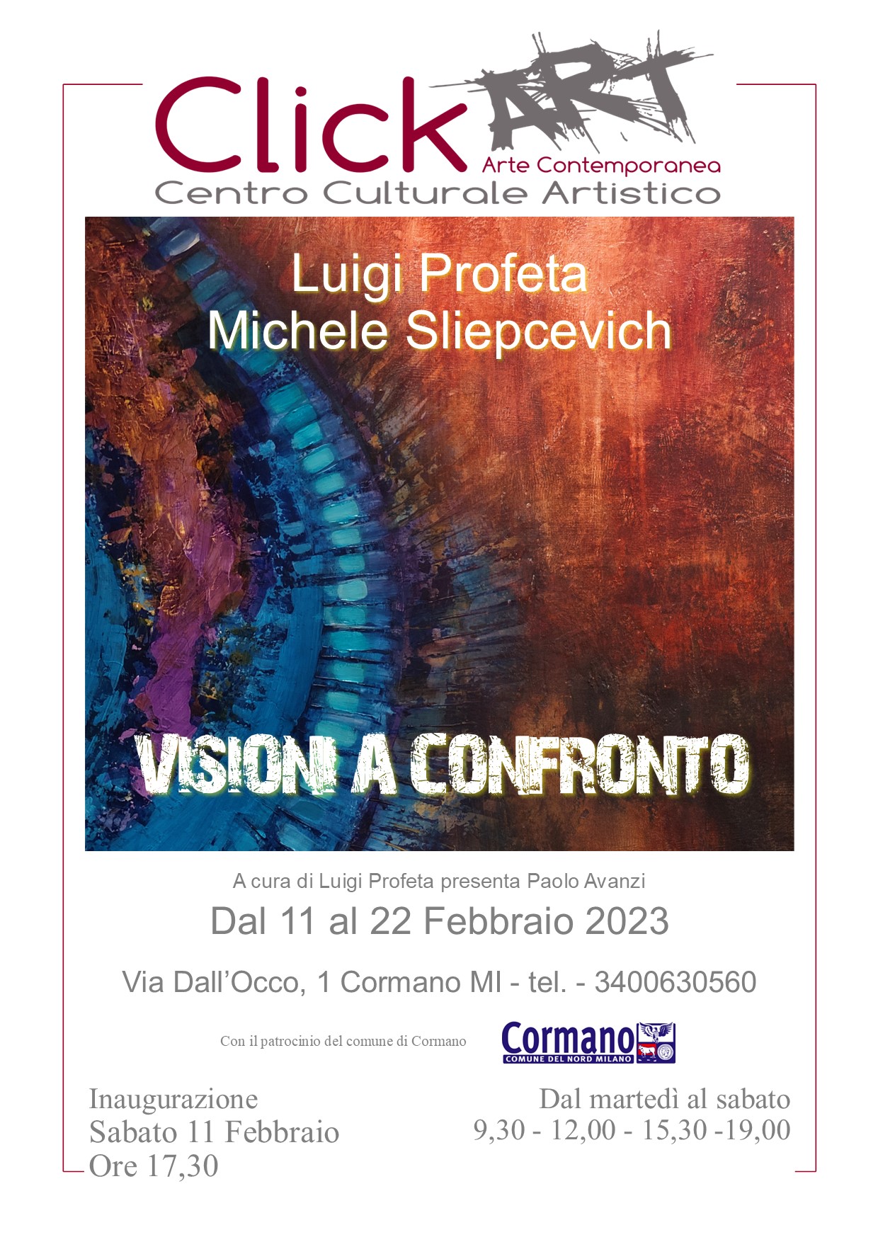 sabato 11 febbraio alle ore 17,30, si inaugura la doppia mostra personale "Visioni a confronto" di Luigi Profeta e Michele Sliepcevich presso il Centro Culturale Artistico Click Art, nel centro storico di Cormano - MI in via Giuseppe Dall'Occo 1 tel. 3400630560