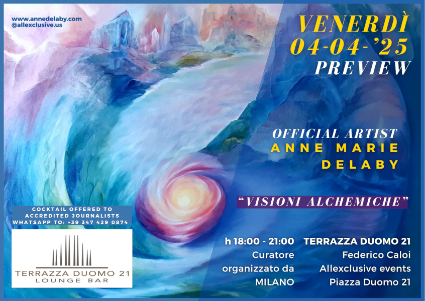 Milano, [Data di rilascio] – Il 04 aprile 2025, dalle ore 18:00 alle 21:00, la Terrazza Duomo 21 Lounge Bar, in Piazza Duomo 21 a Milano, ospiterà la preview esclusiva della mostra d’arte “Visioni Alchemiche” dell’artista Anne Marie Delaby. L’evento, organizzato da Allexclusive Events e curato dal rinomato critico e curatore d’arte Federico Caloi, rappresenta un’occasione imperdibile per scoprire in anteprima le ultime opere del percorso artistico dell’autrice.